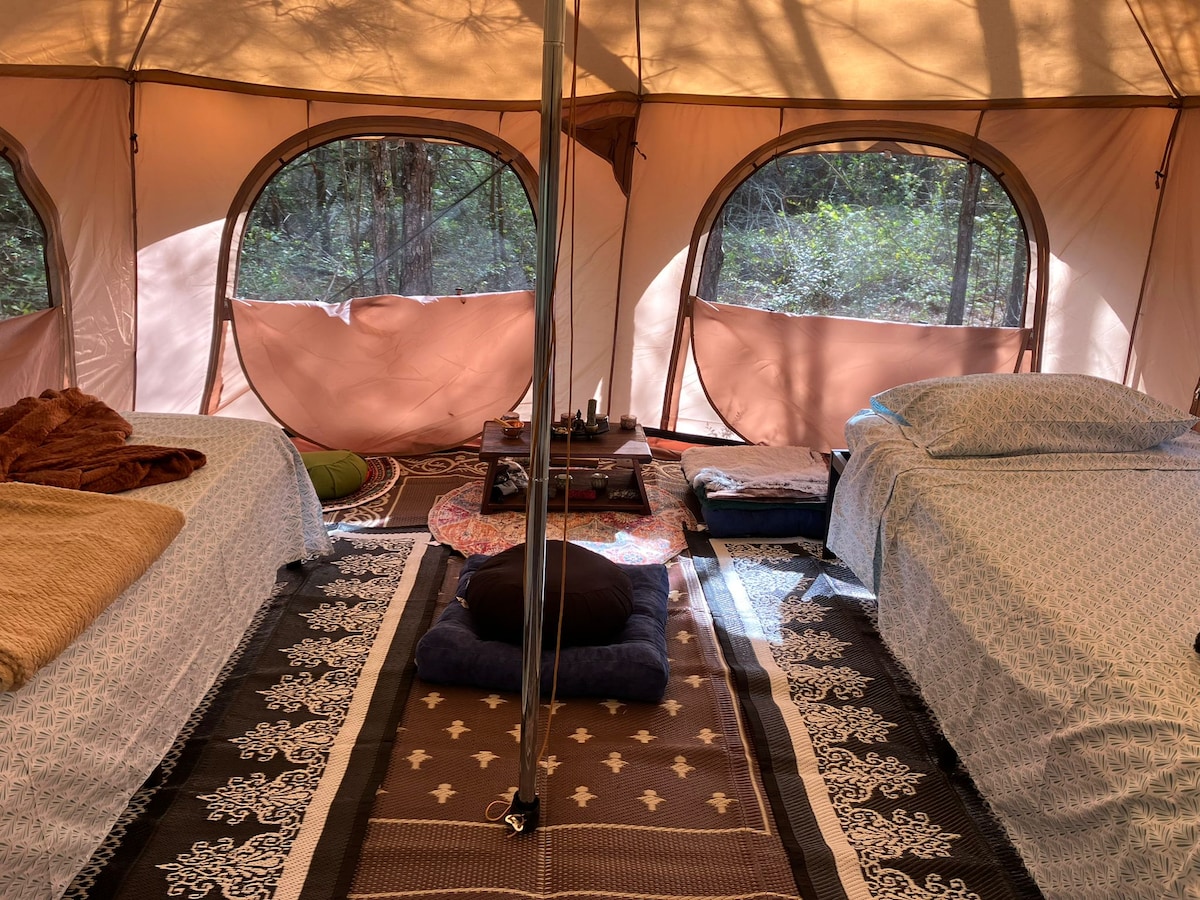 Dieses Glamping-Glockenzelt liegt ein wenig vom Weg entfernt und ist von schönen Yaupon- und Pinienbäumen umgeben. Es verfügt über 2x xl-Betten, die mit Vorankündigung zu einem Kingsize-Bett kombiniert werden können. Es bekommt Teilschatten, Teilsonne und verfügt über eine eigene Feuerstelle. Es ist der Ort, der einer der Toiletten auf dem Grundstück am nächsten liegt. Kinder unter 3 Jahren campen kostenlos!