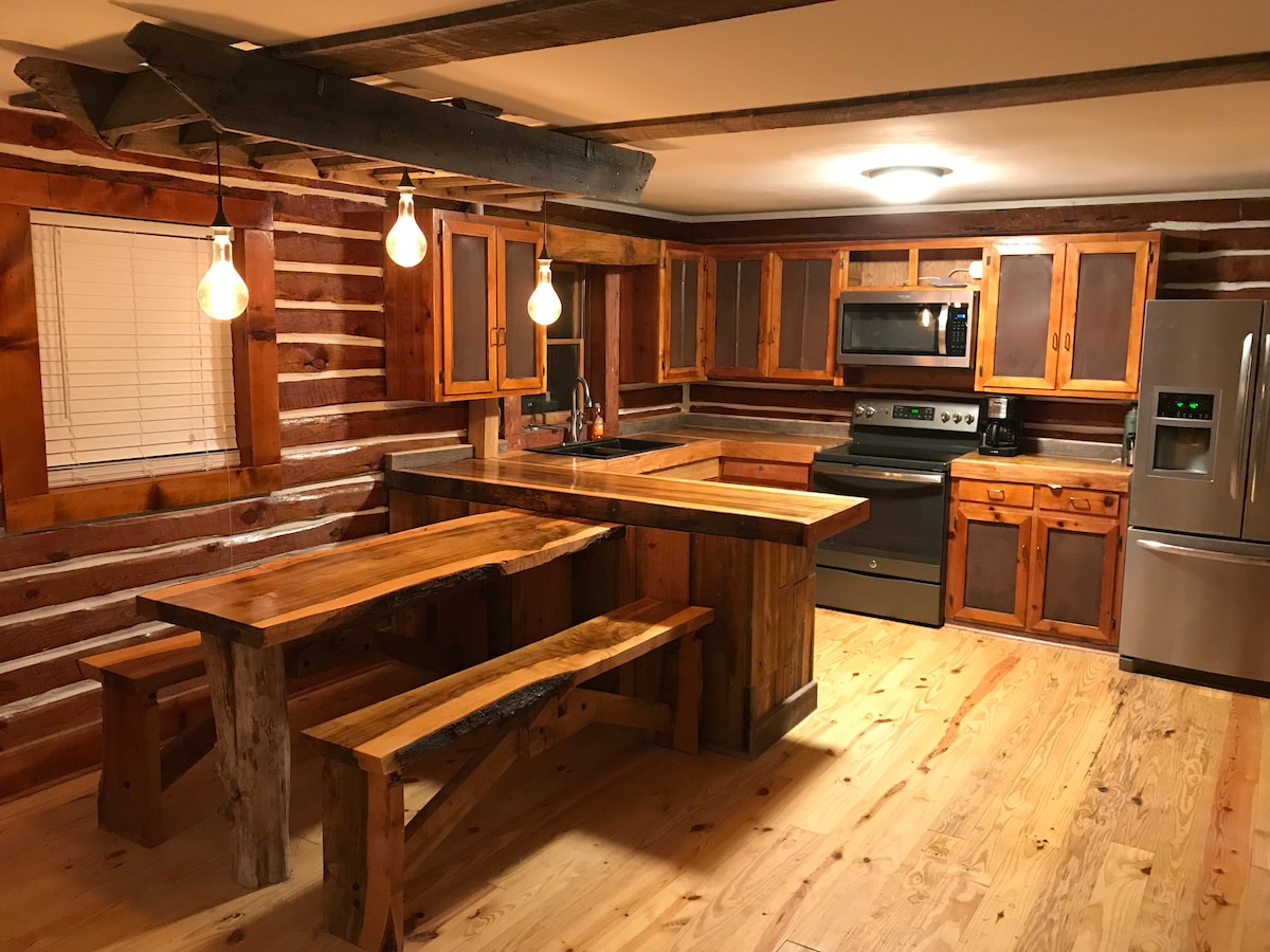 Unsere einzigartige Hütte ist eine 3-Zimmer-Wohnung mit 3 Bädern und einem Familien-/Fernsehzimmer mit einem bequemen Schlafsofa für eine vierte Schlafzimmeroption. WLAN, TV (Roku, Netflix usw.) stehen dir zur Verfügung, wenn du ein Konto hast. Wir bieten Netflix, eine voll ausgestattete Küche, eine Waschküche, große Veranden, einen großen Holzkohlegrill und eine wunderbare Abgeschiedenheit. Schön für eine kleine Familie, die sich zu einem magischen Aufenthalt trifft!