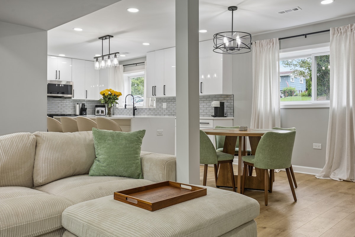 Ein fesselndes, neu renoviertes 3 Schlafzimmer / 2 Badezimmer mit voll möbliertem Keller. Saubere Oberflächen und moderne Annehmlichkeiten schaffen den perfekten, entspannten Raum für dich und deine Gruppe. Minuten von der Innenstadt von Naperville entfernt! Spaziere in die Innenstadt von Lisle für Restaurants, Einkaufsmöglichkeiten, Outdoor-Veranstaltungen, zu Fuß zum Bahnhof Lisle, zum Community Park Lisle mit Wanderwegen, Sommerkonzerte im Freien, Spielplätze, zum Prairie Walk Pond mit wöchentlichem französischen Markt von Mai bis Oktober, zu Fuß zum Sea Lion Aquatic Park.