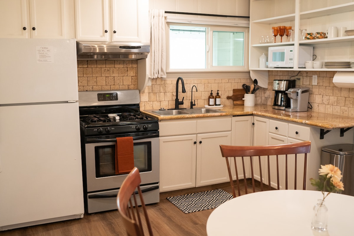 Die Peach Suite ist ein einzigartiges kleines Studio mit offenem Grundriss und 700 Quadratfuß. Perfekt für zwei. Dieses kleine Hinterhaus und das vordere Gartenhaus (ein 100-jähriger Handwerker) wurden restauriert und wieder schön gemacht. Dieses einzigartige kleine Studio befindet sich auf einem großen, halben Hektar großen Grundstück in der Altstadt von Clovis, das nah genug ist, um viele Restaurants und lokale Aktivitäten wie Bauernmärkte zu Fuß zu erreichen. Die Peach Suite hat alles, was du brauchst. Die Dusche und das Badezimmer sind klein, aber sie erfüllen definitiv ihren Zweck.