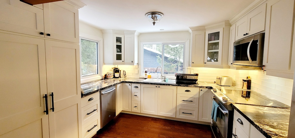 Relax with the whole family at our peaceful hideaway. We have a beautiful river in the backyard and a sandy beach fire pit. It's a minute walk to the beach across the street. It's also 30min away from the Blue Mountain resort. Please note that it’s a downstairs separate guest suite, you’ll have full privacy and the use of the entire backyard, hot tub, bbq and fire pit. My family and I live in the upstairs unit, you may see us in the main driveway. A charge of $60 per extra guest apply so 6 ppl