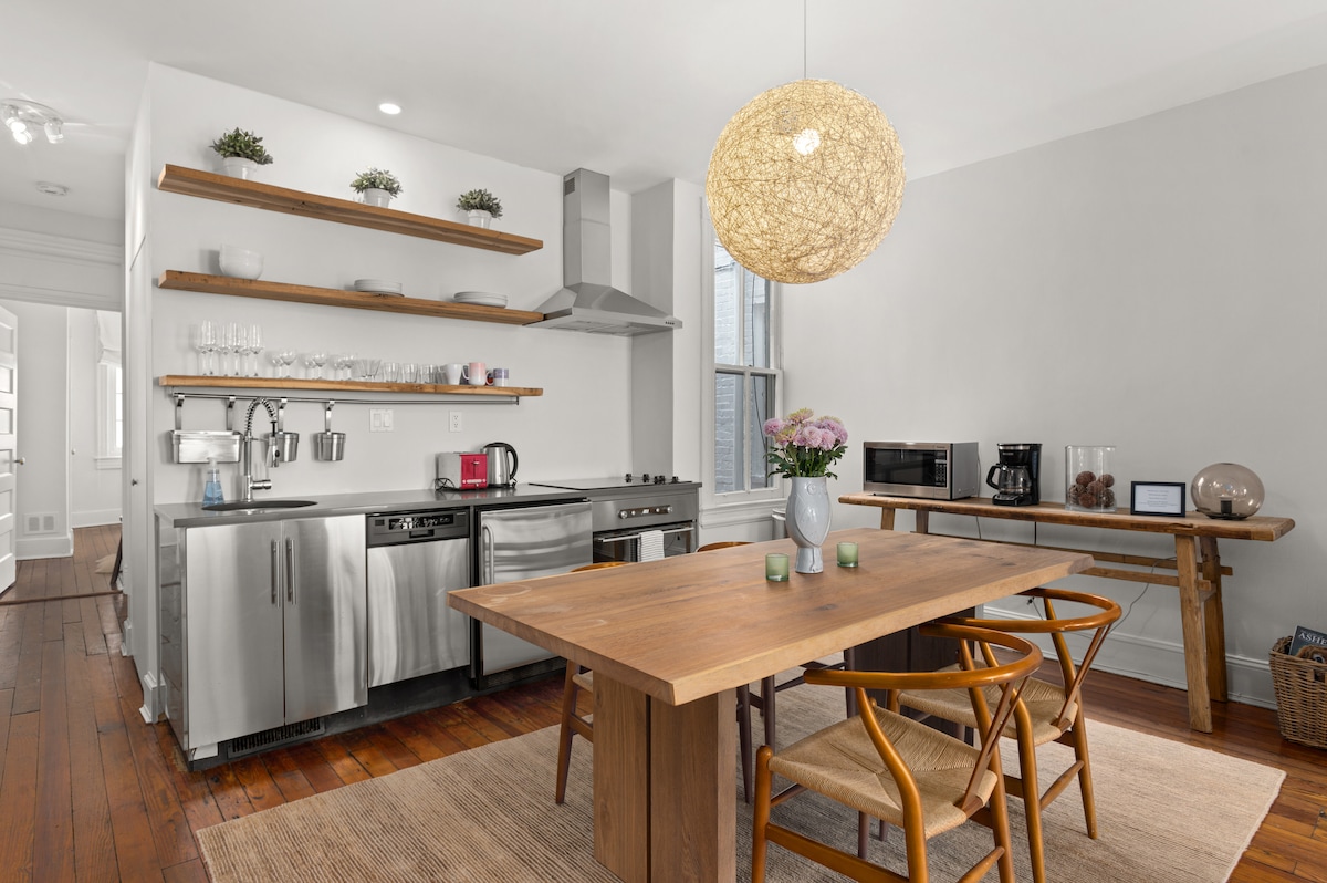 Just a few blocks from M Street and Wisconsin Ave., this modern, 1,000 square foot English basement features exclusive use of the entire lower level of a new Georgetown home and a private patio looking out onto a beautiful garden. Smart home features include voice commands for lighting, heating and cooling, a ceiling fan, door lock, and more. For working, there are two separate work spaces and fast, reliable Internet. For relaxing, we provide a full package of cable TV and streaming services.