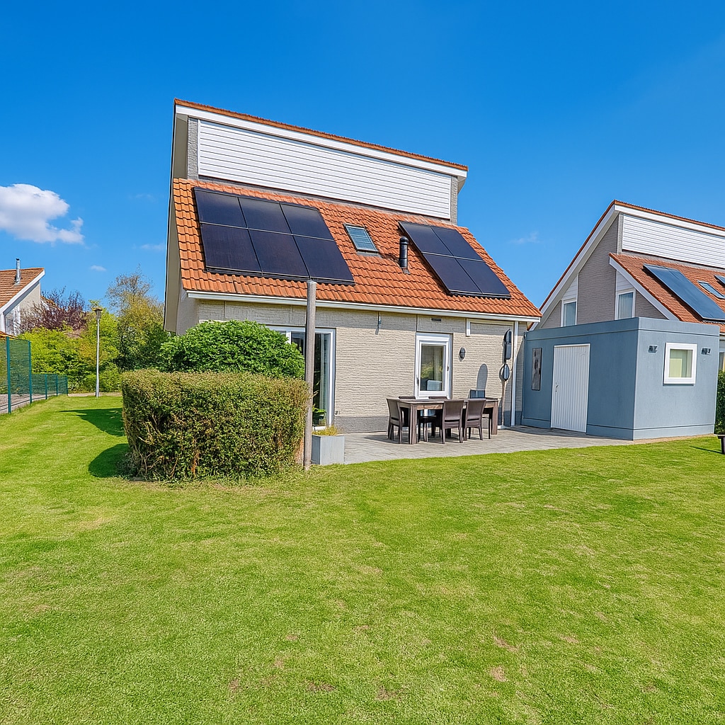 Luxuriöser Bungalow 2014 in unmittelbarer Nähe zum Strand mit Sauna. Ist voll von Komfort und bietet viel Privatsphäre dank der geräumigen, eingezäunten Garten, Sonnenterrasse mit Blick nach Süden und privaten Parkplatz. Carbonfrei durch Solarzellen auf dem Dach, elektrisches Kochen, Klimaanlage zum Kühlen und Heizen und einen elektrischen Kessel. Schöne Naturschutzgebiete und historisch malerische Dörfer rundum. Viele Wander- und Fahrradrouten. In der Nähe von Hotspots für Wind- & Wassersport: Surfen, Kite, SUP, Tauchen, Segeln, zwei