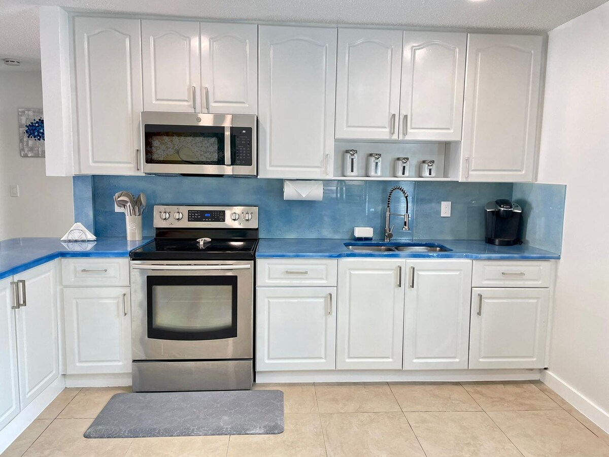 Erlebe Luxus-Komfort und modernen Stil, nur 10 Fahrminuten vom Strand entfernt. Du wirst die einzigartige, maßgefertigte Küchenarbeitsplatte und 2 gemütliche Betten lieben. Wir haben an alles gedacht, um deinen Aufenthalt komfortabel zu machen: 65-Zoll-4K-Smart-TV, Waschmaschine/Trockner, 2 eigene Parkplätze, eine private Terrasse und eine voll ausgestattete Küche. Es gibt einen eigenen Schreibtisch und Highspeed-Internetz. Hydro-Jet-Duschsystem und beleuchteter Spiegel im Badezimmer, farbwechselnder Stimmungsspiegel, schlagfeste Fenster, zentrale Klimaanlage, Check-out am Mittag.