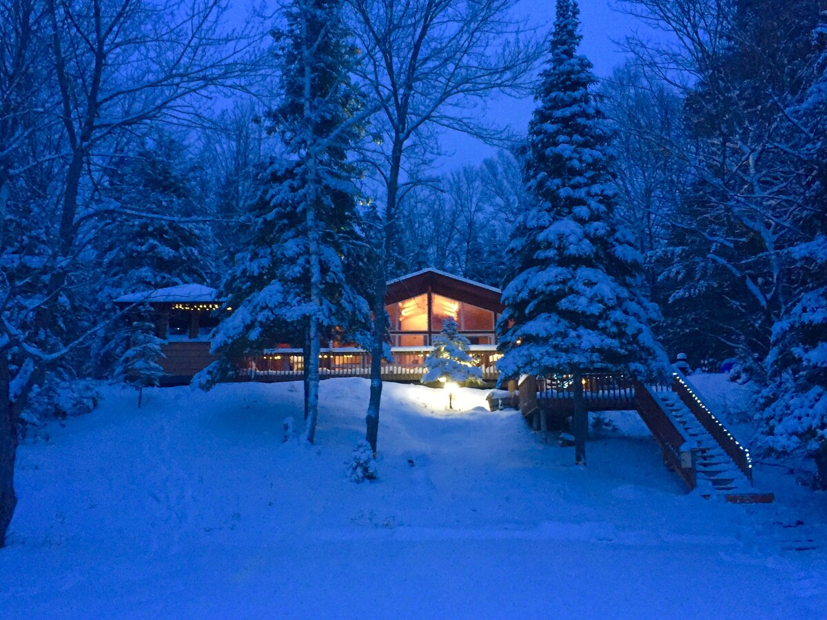 Lakefront - Aframe - Pet Friendly - 2 bedroom, 4 beds - best fishing spot on the lake! Escape to the picturesque winter wonderland of Haliburton and experience the magic of the season in our charming A-Frame cottage. The Lazy Bear Lodge is nestled amidst snow-covered landscapes and is the perfect getaway for those seeking tranquility and adventure. !! IMPORTANT !! 4 wheel drive needed in the winter! The area is hilly and the driveway is sloped. Cottage heated by a wood stove - wood provided.