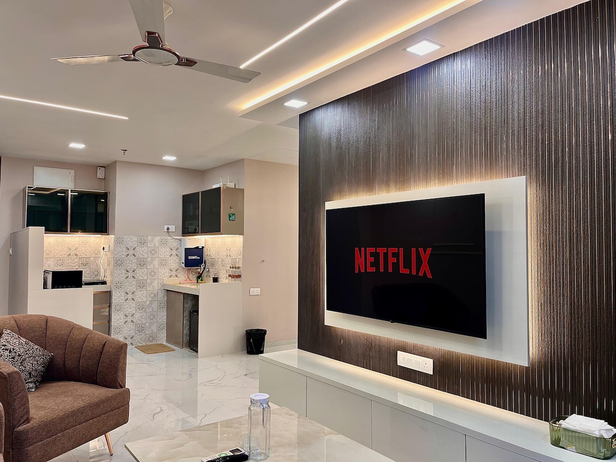Welcome to Your Modern Day-Chic 1-Bedroom Apartment Retreat near BKC! With its minimalist design, ample workspace, entertainment options, and essential amenities, it caters to the needs of both business and leisure travelers! Features: ★ Large Work-Desk ★ Free High-Speed WiFi ★ Smart TV ★ Tata Sky with all HD Channels ★ Sound Bar ★ Microwave/Fridge ★ Air Fryer ★ Air Purifier ★ Water Purifier Book now and experience the perfect blend of modernity and comfort!
