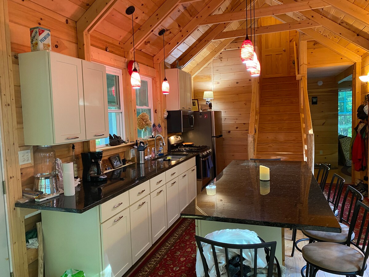 Entfliehe in ein traumhaftes Holzrahmenhaus in den Wäldern von Maine! Hohe Balken, Fußbodenheizung, ein Kingsize-Hochbett und eine knisternde Feuerstelle erwarten dich. Trinke Kaffee auf einem der beiden Decks, wandere auf den Bradbury Mountain (3 Minuten entfernt), kaufe im Freeport ein (10 Minuten entfernt) oder speise in Portland (20 Minuten entfernt) – und kehre dann in dein gemütliches Refugium unter den Sternen zurück. Voll ausgestattete Küche, gewölbte Decken, Fußbodenheizung, private Einfahrt, Feuerstelle und friedliche Waldblick machen es zum perfekten Rückzugsort das ganze Jahr über.