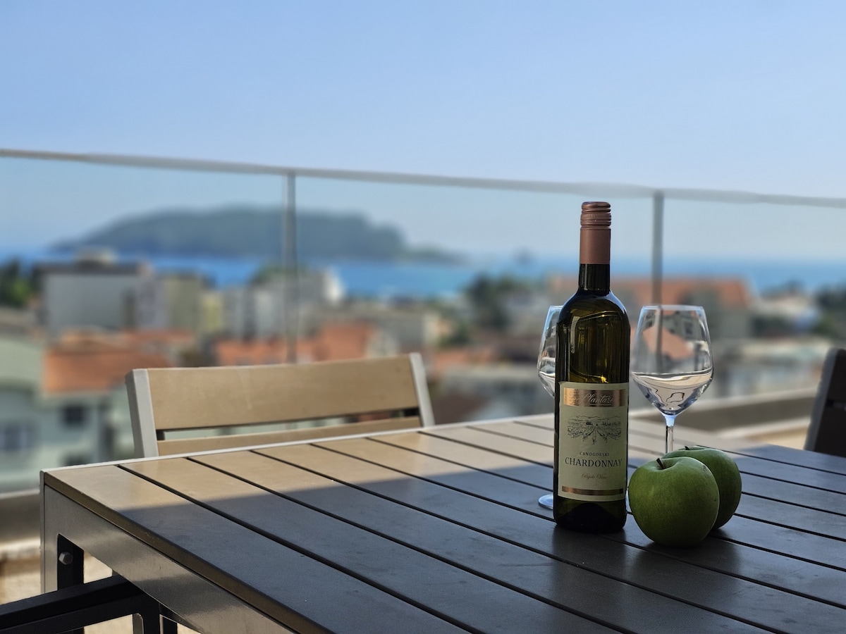 Wir bieten eine neue stilvolle Wohnung mit Meerblick, origineller Raumaufteilung und komfortabler Designlösung. Zur Verfügung der Gäste stehen ein separates Schlafzimmer, ein großes Wohnzimmer mit einer ausgestatteten Küche und einer Bar. Beide Zimmer verfügen über SmartTV, Heizung und Klimaanlage. Alle Fenster bieten Meerblick und die Terrasse verzaubert mit Blick auf die Insel - eine der Hauptattraktionen von Budva. Die Wohnung befindet sich 5 Autominuten vom Strand und der Altstadt von Budva entfernt. Und 17 km vom Flughafen Tivat entfernt.