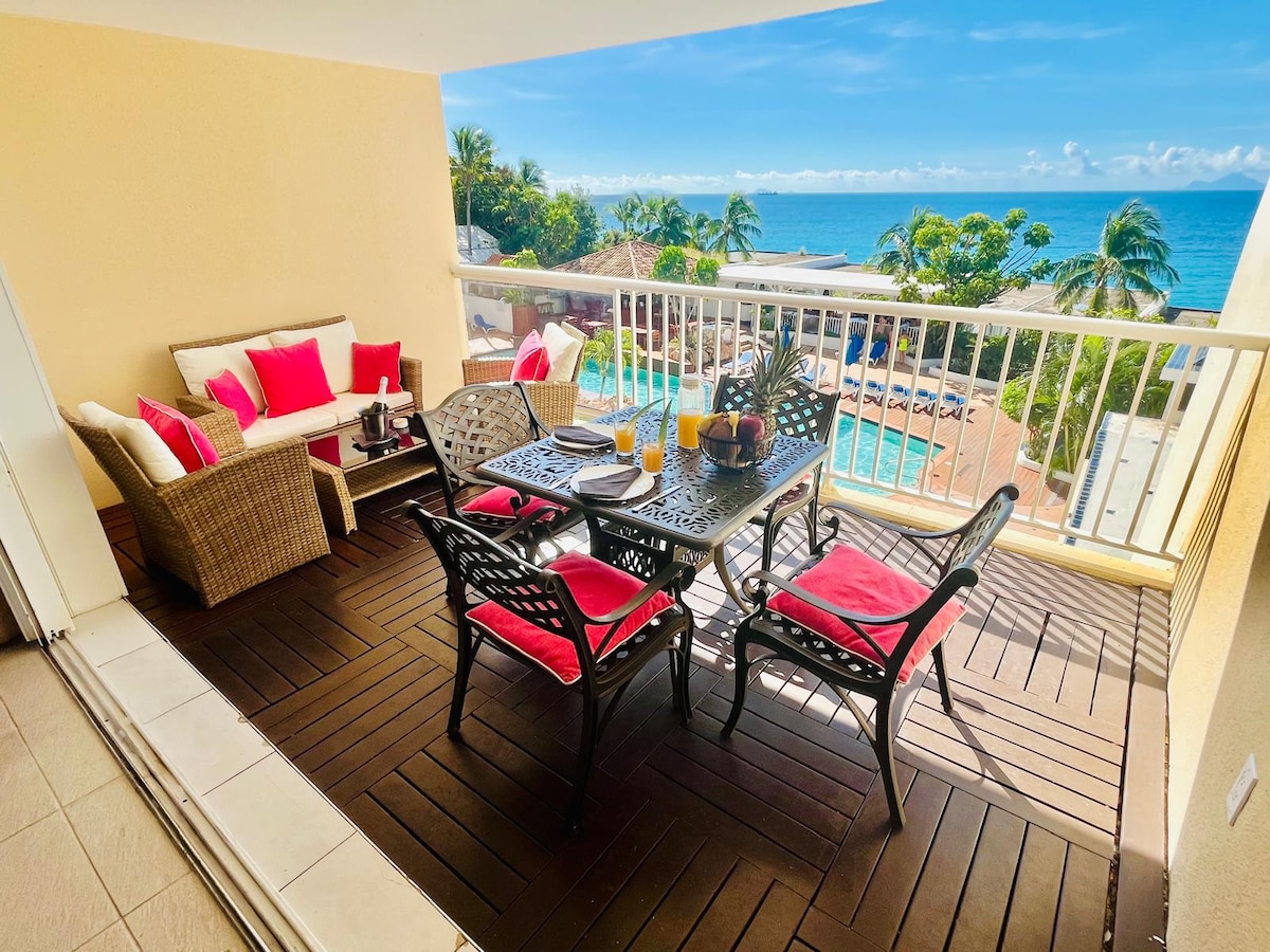 Diese luxuriöse Wohnung mit 2 Schlafzimmern und 2 Badezimmern bietet einen atemberaubenden Meerblick und einen privaten, weitläufigen Pool, der ein Gefühl der Ruhe bietet, das unübertroffen ist. Größter Pool in der Nachbarschaft. Meerblick von der Dusche! Durchdacht von einem erstklassigen Gastgeber verwaltet, wurde jedes Detail berücksichtigt, um sicherzustellen, dass dein Aufenthalt komfortabel und unvergesslich wird. Eingebettet in der Nähe des Strandes und nur wenige Schritte von einer schicken Strandbar entfernt, bietet dieser Ort einige der besten Aussichten der Insel - eine Oase der Schönheit im Herzen von St. Maarten.