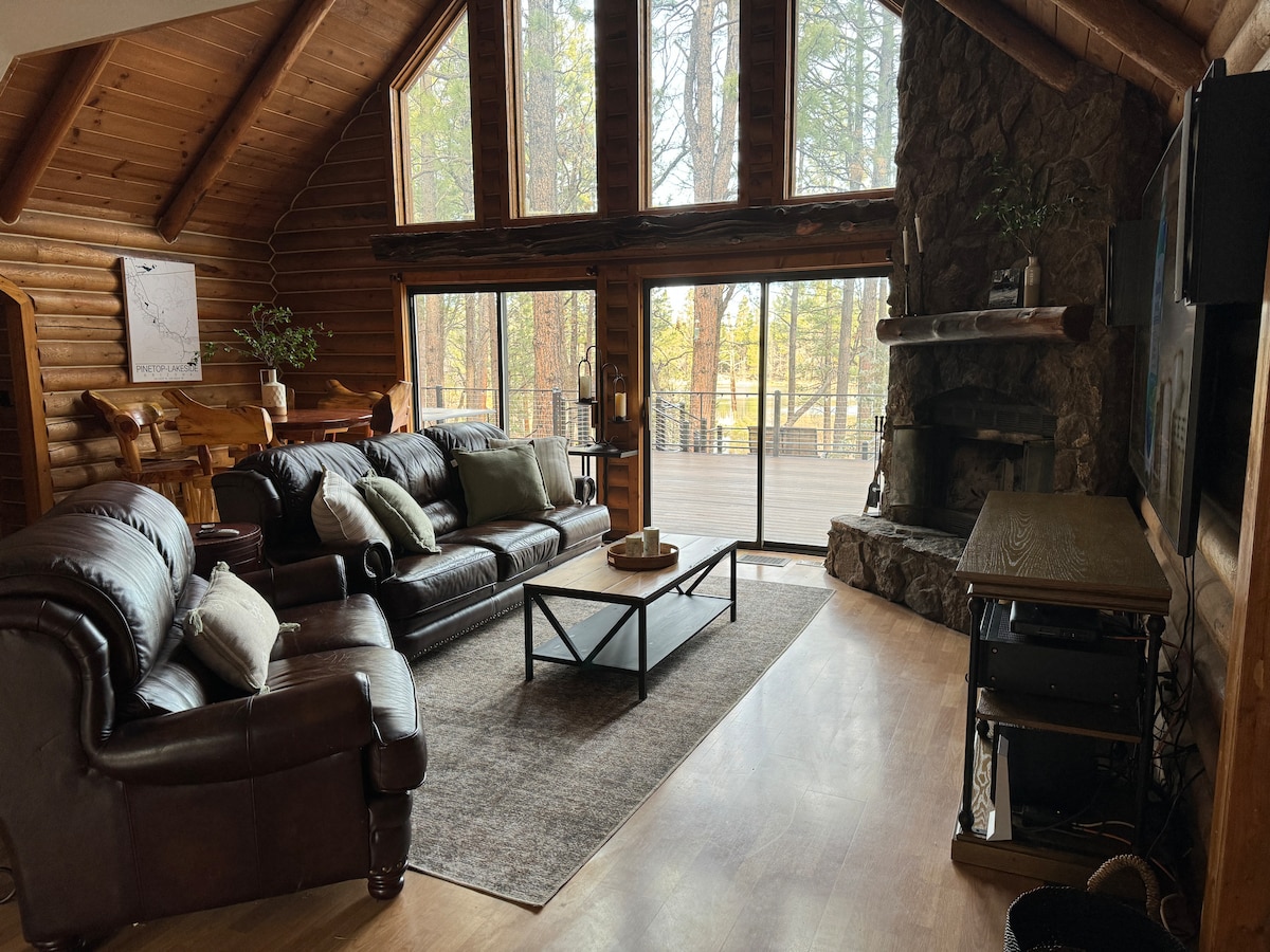 2 fantastische Schreibtischstationen – 1 unten mit Stehpult und 1 Schreibtisch im Loft, beide mit 22-Zoll-Monitoren, HDMI-Kabeln und vielen Steckern ausgestattet. 1 Schlafzimmer im Erdgeschoss mit gemütlichem Kingsize-Bett und Zugang zum kompletten Bad, 500 Quadratfuß Loft mit 2 Queensize-Betten, Tagesbett, Pack and Play, 2 Fernsehern und 1/2 Bad. Six Pines Lodge Hexagon Real Log Cabin! Vollständig eingezäunt und haustierfreundlich! Bring einfach deine Toilettenartikel mit und genieße die schönen Arizona White Mountains!