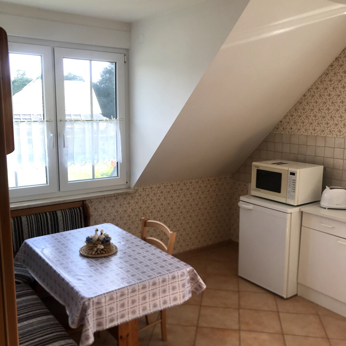 Landhaus auf zwei Ebenen mit 65qm! Wohnküche voll ausgestattet, Bad - WC, begehbare Dusche, Waschmaschine, Wäscheständer; Wohn- / Schlafkombination im offenen DG, Terrasse mit Grill, Gartennutzung nach Absprache, Stellplatz für ein Fahrzeug, Abstellmöglichkeit für Fahrräder. 2x Aufbettung möglich 20€/Nacht/Person ab 5 Jahre. Tipps für Ausflüge können bei Bedarf angefragt werden, eine Infomappe liegt aus - ansonsten verfahre ich frei nach der Devise "Alles kann, nichts muss!"