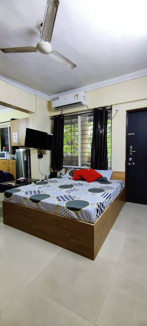 Modernes Studio 1BHK in Amanora Adreno Towers mit ruhigem Blick auf den Pool. Befindet sich im 3. Stock mit Aufzug. Genieße Highspeed-WLAN, eine einfache Küche, einen Kühlschrank, eine Waschmaschine und 2 Balkone. Kostenloses Parken auf dem Grundstück. Paarfreundlich und perfekt für lange Aufenthalte oder Geschäftsreisende. Ideale Mischung aus Komfort und Bequemlichkeit in einer Premium-Gated-Community.
