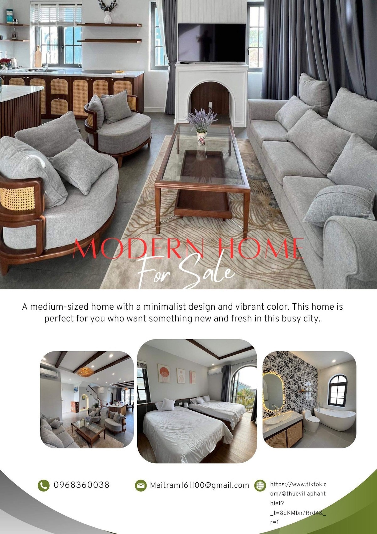 Ngôi nhà có hồ bơi và bãi biển riêng biệt, sân vườn đầy cỏ cây hoa lá, cách trung tâm thành phố Phan thiết 8km, cách làng chài 50m, nội thất sang trọng phong cách nhiệt đới, trong nhà đầy đủ vật dụng tiện nghi hiện đại.
