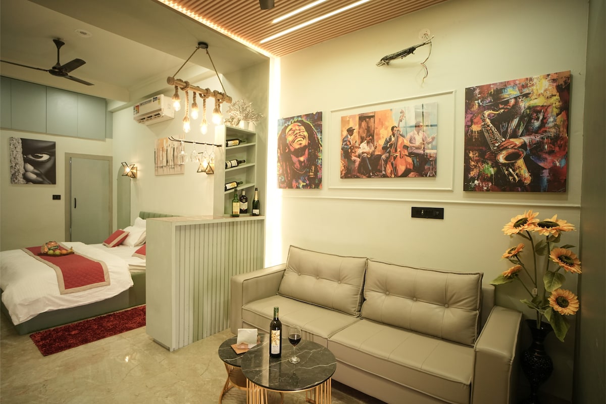 The Casa99 Premium Suite offers a luxurious and spacious retreat, featuring a comfortable bedroom. The suite is equipped with soft sofas for relaxation, an attached modern bathroom, and a fully equipped kitchen with essential appliances like a stovetop, fridge, and cookware. With elegant decor, ample space, natural light, complimentary Wi-Fi, and air conditioning, the Premium Suite ensures a refined and comfortable stay.