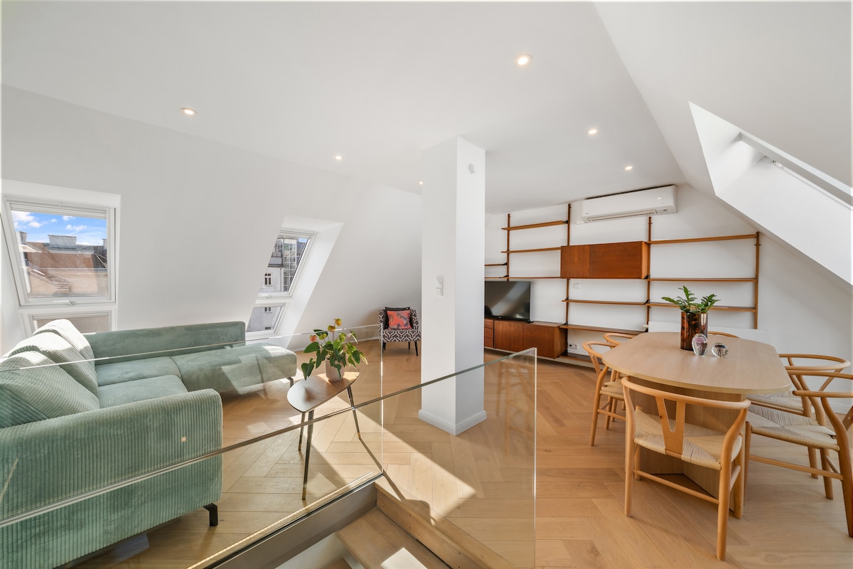 Charmante klimatisierte Altbauwohnung im 1. Stock, ideal für 2-4 Personen. Geräumiges Schlafzimmer mit Boxspringbett, Leseecke im Erker und Schreibtisch. Wohn-Esszimmer mit ausziehbarer Couch und TV. Gut ausgestattete Küchenzeile, großer Esstisch und englische Möbel. Modernes Bad mit Walk-in Dusche, Waschmaschine. Separates WC mit Duscharmatur.