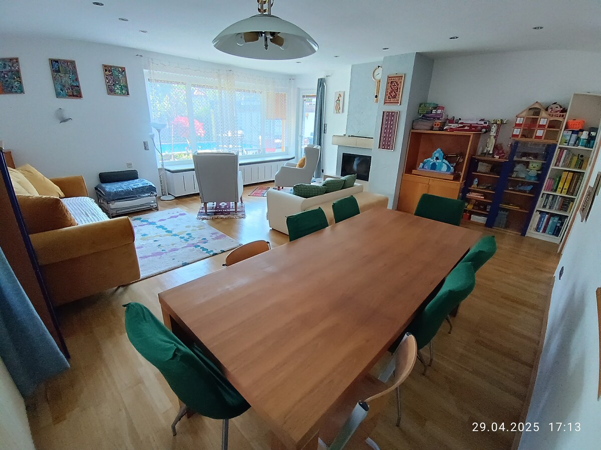 We are located in a wine growing area with vine yards nearby, a noble residential area in Vienna.10 minutes drive from „Schloss Schönbrunn“+ 25 minutes by car from the center. Make yourself at home and enjoy a 160m2 private luxurious house&beautiful garden&terrace+1 free private parking spot. 4 bedrooms, 2 bathrooms.Air condition,Smart TV&Netflix,TV in all 4 sleeping rooms.Internet in the whole house &a home office corner. Fully equipped kitchen&equipped laundry room.