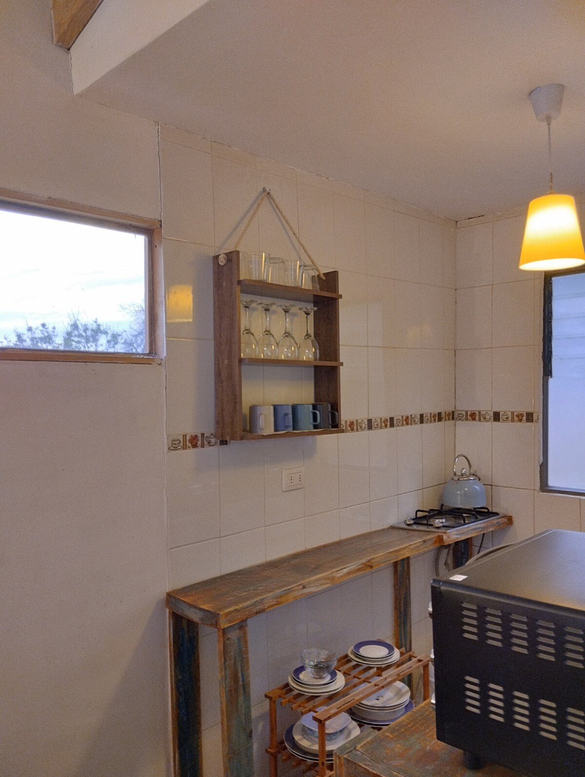 Private rustikal-moderne Hütte 2 Blocks vom Plaza de Pisco Elqui entfernt, in der Nähe von Restaurants und Geschäften. Privater Parkplatz. 1 Schlafzimmer mit eigenem Bad, 1 Doppelbett (Bettwäsche, Decken, Bettdecke, Kissen und Kissen). 1 Nachttisch, 1 Lampe, 2 Bettvorleger, Sofa, restaurierte antike Möbel und 1 Bluetooth-Lautsprecher. 1 Elektroherd für den Winter. Küche, Geschirrspüler und Minibar auf der Terrasse (Töpfe, Geschirr, Besteck, Teekanne usw.) und Holzkohlegrill. Rundherum viel Vegetation.