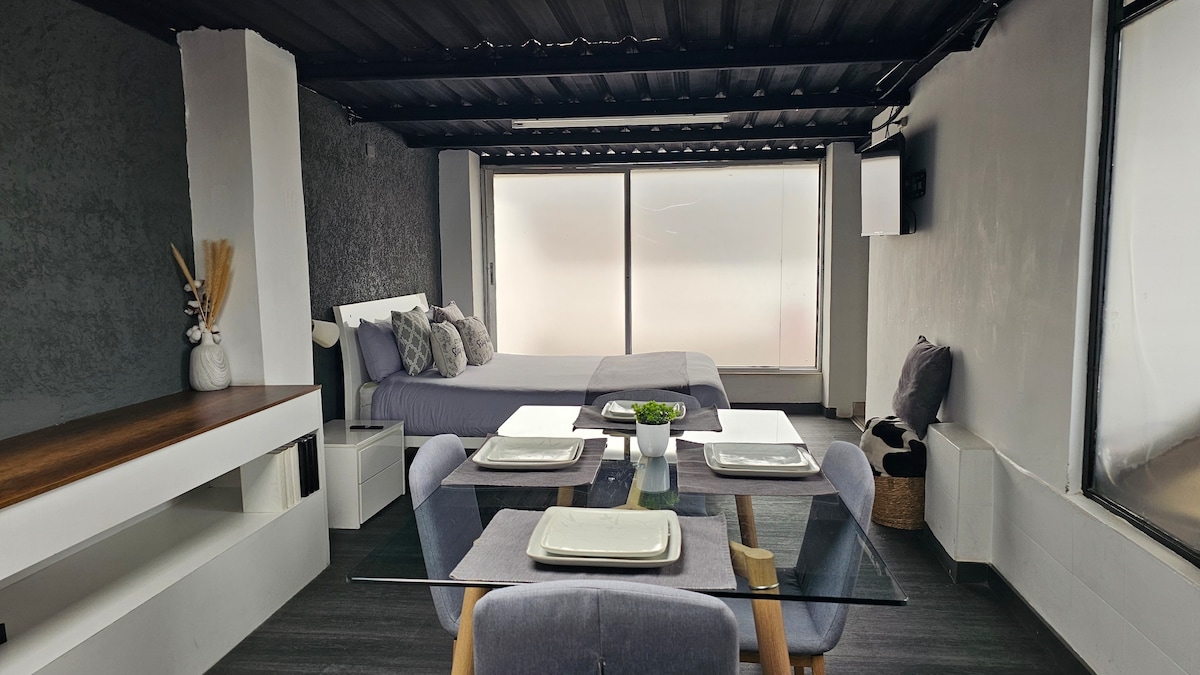 Genießen Sie ein elegantes Apartment mit einer privaten Terrasse, einem natürlichen Rasen und einer gemütlichen Atmosphäre, in der Sie sich wie zu Hause fühlen werden. Entspanne dich mit von Alexa gesteuerter Beleuchtung und Musik, schnellem WLAN, Arbeitsbereich und Fernseher in jedem Schlafzimmer. Erleben Sie draußen ein einzigartiges Erlebnis: PRIVATE Terrasse für Lagerfeuer oder Asados unter den Sternen, subtil geteilter grüner Bereich für Picknicks oder Lesen inmitten der Natur. Ideal für Paare, Familien oder Reisende, die eine stilvolle und komfortable Pause suchen