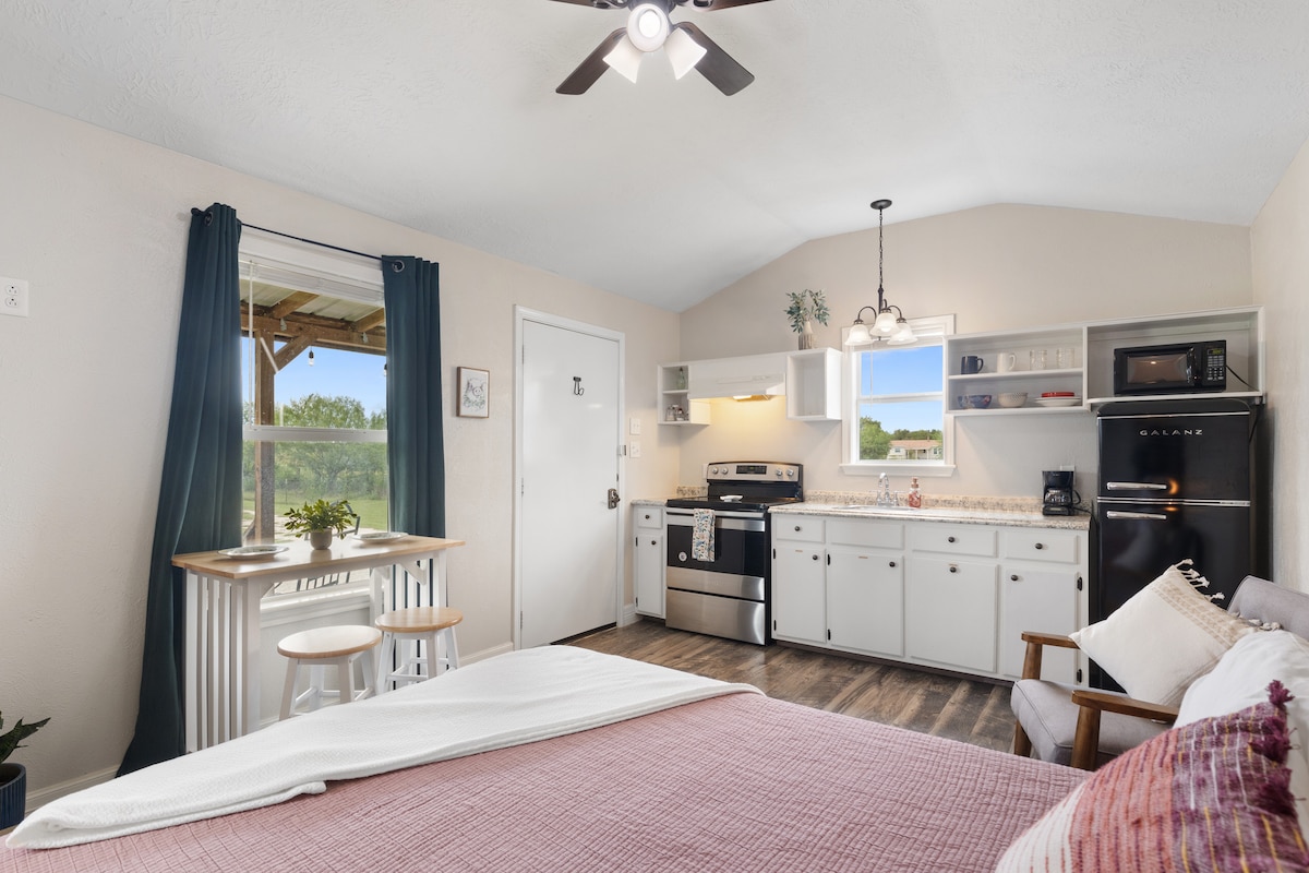 Das Chula Cottage ist der ideale Ort für einen Kurzurlaub. Du kannst die Schönheit der Natur und ein wenig Bauernhofleben erleben. Genieße das Umherstreifen einiger Hühner! Malerisch und niedlich, abseits des Highway IH35, ist ein Ferienhaus mit 1 Schlafzimmer. Geräumig, aber warm und gemütlich. Das Wohnzimmer verfügt über eine bequeme Schlafgelegenheit, einen Flachbildfernseher mit Kabel und kostenfreies WLAN. Die Küche ist mit einem Herd in voller Größe mit Backofen, Mikrowelle, Minikühlschrank mit Gefrierfach und Keurig-Kaffeemaschine ausgestattet.