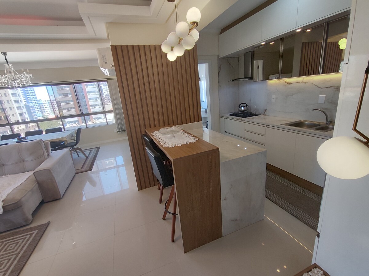 Apartamento novo, recém-mobiliado, localizado em prédio novo, a aproximadamente 200 metros da praia (2ª quadra do mar). Possui 2 quartos, sendo uma suíte e um quarto individual, ambos com cama de casal, além de sofá-cama casal na sala, acomodando até 6 hóspedes. Conta com 1 vaga de estacionamento na garagem. Observações importantes: -Roupa de cama disponível, mas não ofereço toalha de banho.