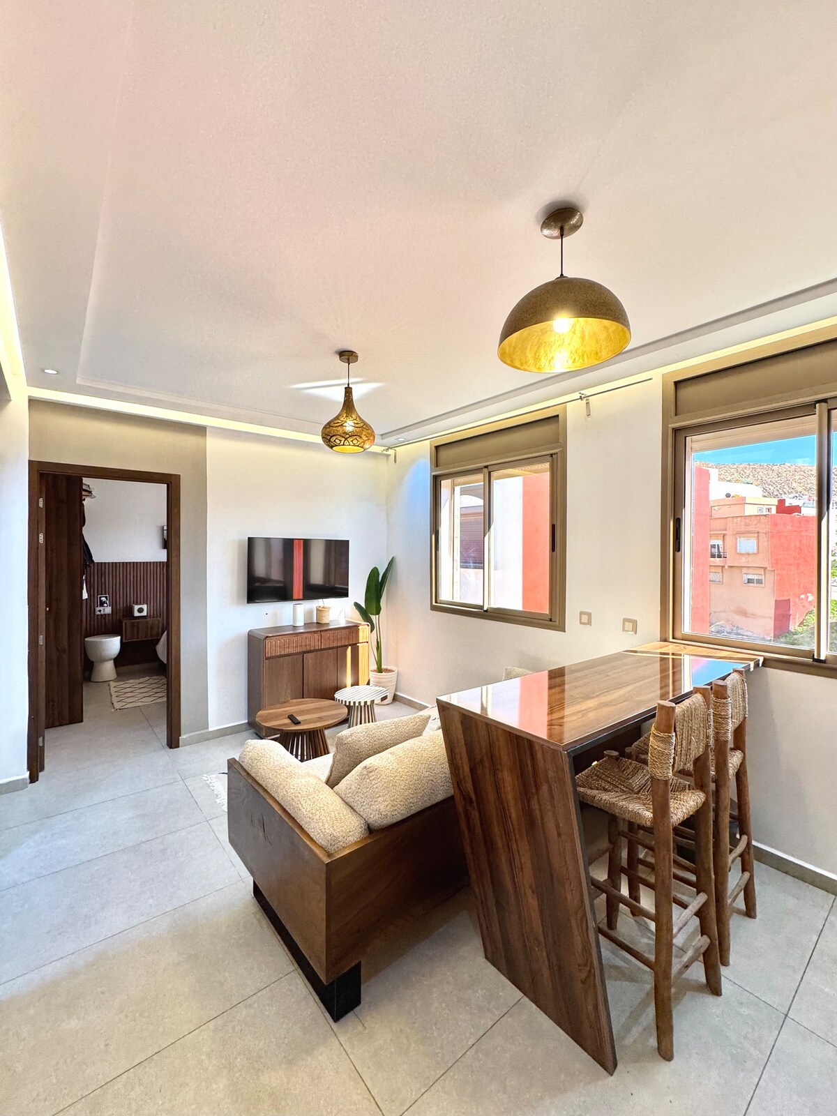 Entdecken Sie Imsouane Ocean View, eine 50 m² große Wohnung für 4 Personen, die 2025 im zweiten Stock einer Residenz mit 3 Wohnungen gebaut wurde, nur 5 Minuten von der Bucht von Imsouane entfernt. Gemütliches Zimmer mit Balkon, Wohnzimmer mit Ecksofa, Einbauküche, WLAN und Klimaanlage. Entspannen Sie sich auf der gemeinsamen Terrasse im obersten Stockwerk mit Waschküche und lassen Sie sich von der Atmosphäre und dem Zauber von Imessouane verzaubern.