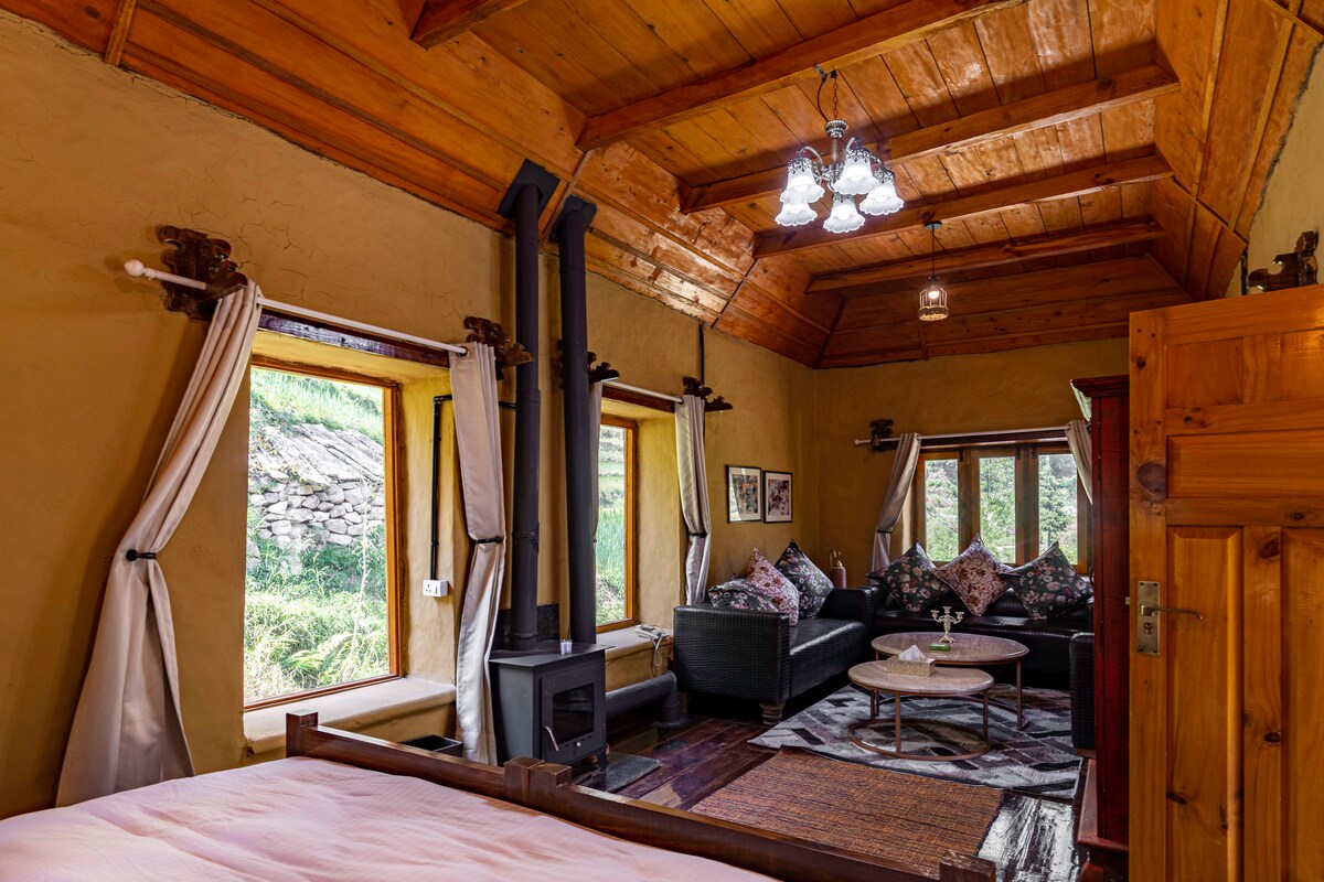 When you check into 13 Steps Organic Farm & Orchards, you are the only guests in over 10 acres of pristine, organic farmland. Keeping you company are stunning mountain views, a variety of fruit trees and our hill dogs, cows and goats, along with a variety of fauna that pays occasional visits to the forest land. 13 Steps has been kept like a forest and we have never chopped a single tree, making it a truly pristine jungle hillside farm. We are nestled in the lower Himalayas at 2000 ft above sea