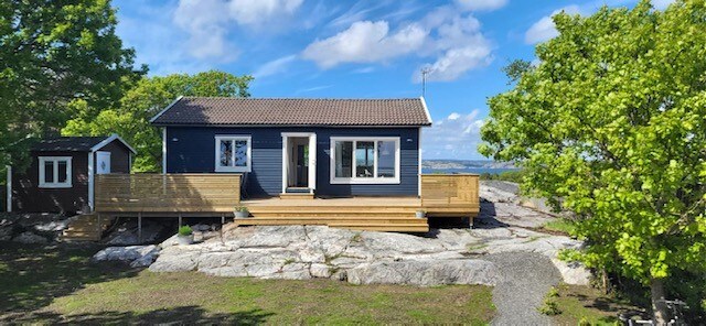 Cottage mit Meerblick in hoher abgeschiedener Lage. Küche und offenes Wohnzimmer, 2 Schlafzimmer, 1 Badezimmer, 1 WC. Schlafzimmer 3 befindet sich in einem separaten Gästehaus. Voll ausgestattete Küche mit Geschirrspüler, Mikrowelle, Induktionsherd und Backofen. 200 m zum Meer mit Klippen und Sandstrand. Mehrere möblierte Terrassen, Rasen und Grill. Nur wenige Gehminuten vom Lebensmittelgeschäft, der Bushaltestelle und der Fähre nach Åstol und Dyrön entfernt Tjörn bietet alles von schöner Natur, Schwimmen, Angeln, Paddeln, Wandern bis hin zu Kunst und Restaurants.