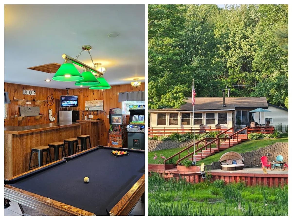Enjoy this beautiful retreat that will provide you a peaceful and FUN getaway. Our home sits on one of the “fingers” of Wixom Lake and currently has a small stream running through (not accessible). If you're not familiar with this area the dams failed in 2020 but there is still a ton to enjoy on the property and the surrounding area. The home features 2 bedrooms and 2 full baths, separate rec room (pool table, dart board, bar, arcade, tv) BBQ grill, hot tub, scavenger hunt, yard games, etc.....