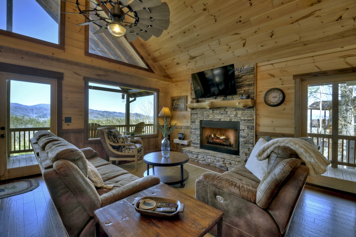 Spacious 2-bedroom ridge cabin with sweeping mountain views. Designed for two couples or a small group, with two private California King bedrooms (each with its own private bathroom) and shared living space that makes gathering easy. Enjoy a private hot tub, indoor fireplace, full kitchen, and a deck built for sunset evenings. Adventure nearby, privacy when you return. Designed for gathering without sacrificing comfort.