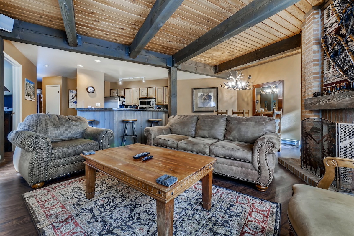 Ski condo only 5 minutes ride to ski mountain on free bus at condo complex and short drive to downtown. Hot tub out back door! King bed in private bedroom. Updated bathroom 2025 and new flooring throughout condo. -Full size, well stocked kitchen with regular & Keurig Coffee -Living room with New Gas Fireplace, leather reclining sofa, 50 inch TV, high spd WiFi, cable and streaming (Netflix, Amazon Prime, HBO Max). -Washer/Dryer in unit -Free Bus Stop: short walk from condo door -Ski Locker