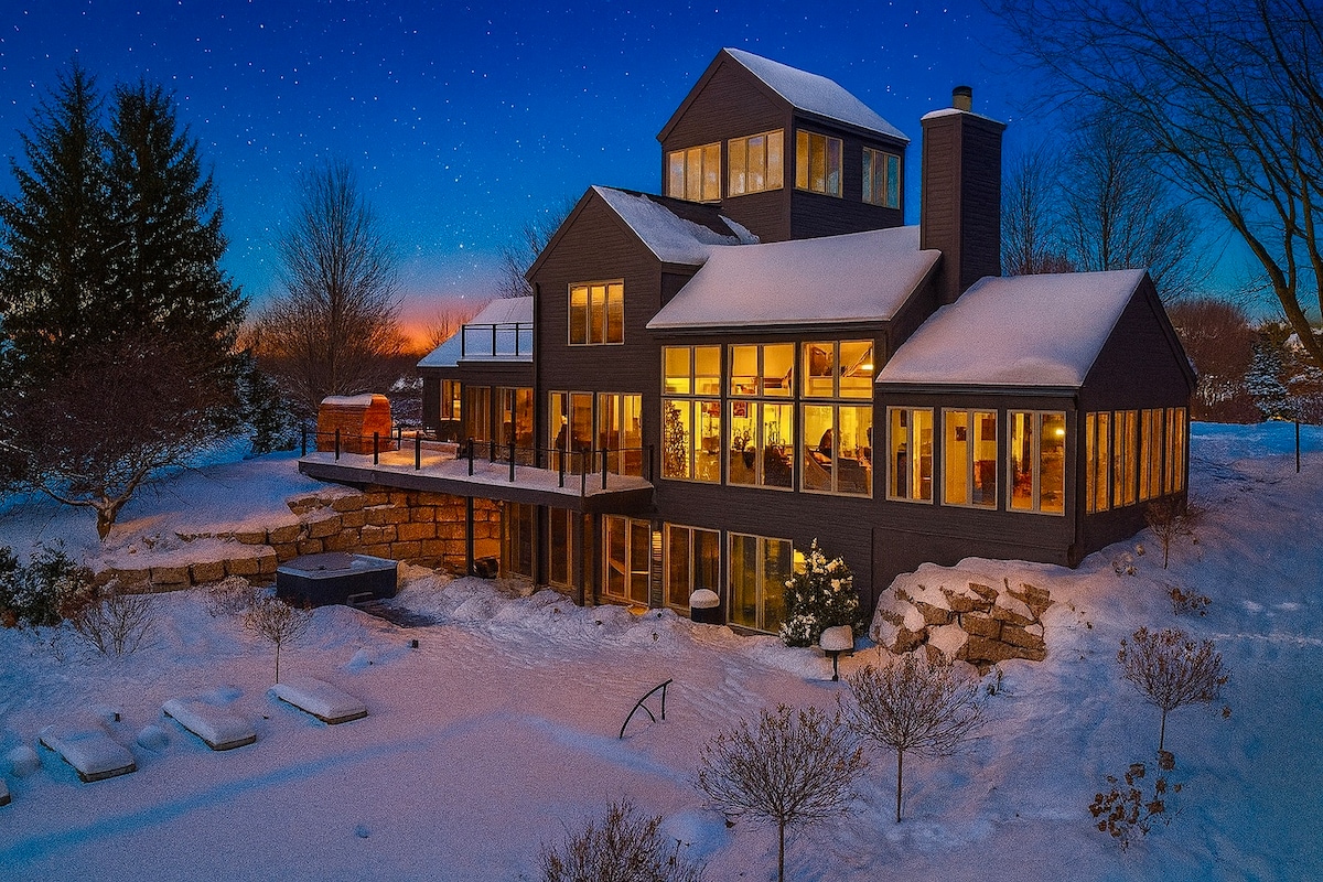 Entfliehe diesem 4.000 Quadratfuß großen Rückzugsort, perfekt für Familientreffen oder Gruppen. Entspanne dich mit eigenem Whirlpool, Sauna, Dampfdusche und zwei Kaminen. Gönn dir deinen inneren Koch: Bereite kulinarische Köstlichkeiten in der Küche des Gourmetkochs zu und fordere deine Freunde dann zu einem Tischfußball- oder Pokerspiel heraus. Das GTA erwartet dich: Genieße uneingeschränkten Zugang zu allen GTA-Annehmlichkeiten, einem Pool- und Erholungskomplex, See und Yachthafen und über 25 Meilen malerischen Wanderwegen. Das Skigebiet Downtown Galena & Chestnut Mountain sind beide 10 Minuten entfernt.
