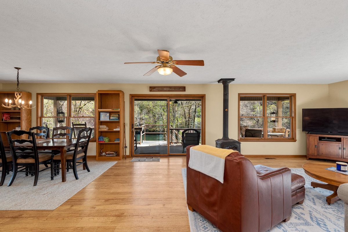Eingebettet auf einem großen Grundstück direkt am Fluss. Setz dich auf die große Terrasse und genieße die Tierwelt, die schöne Landschaft und wahre Ruhe. Blockhaus, voll möbliert mit hochwertigen Akzenten. Master-Suite auf der Hauptebene, Küche für Köche, Fernseher im Wohnzimmer und im Hauptschlafzimmer. Gewölbte Decken und Fenster in Hülle und Fülle machen dieses Haus sehr komfortabel für alle Gelegenheiten. Private Bootsrampe für die kleine Unterteilung macht es dir leicht, ein Boot zu starten oder einfach vom Ufer aus an der großen Feuerstelle zu fischen. Das Haus wurde kaum bewohnt!
