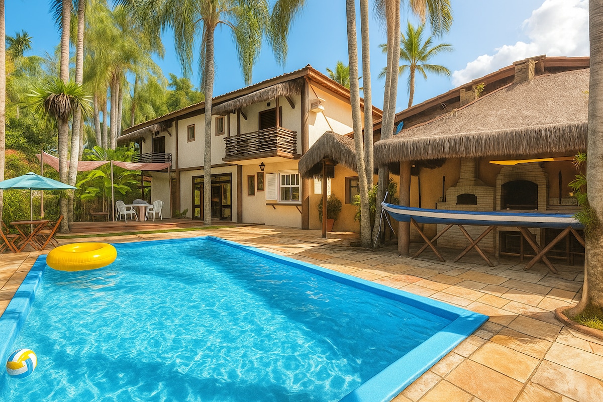 Haus in geschlossener Wohnanlage, charmante rustikale moderne Dekoration, nur 7 Minuten zu Fuß vom Strand und 2 Minuten von den wichtigsten Restaurants und Supermärkten entfernt. Umgeben vom Grün des Atlantischen Waldes, neu renoviert, 3 Garagenplätze, 3 Doppelsuiten, die bequem bis zu 6 Personen und 3 Kinder beherbergen. Die Küche ist für diejenigen, die es genießen, mit Familie und Freunden zu kochen, da sie in das sehr geräumige Wohnzimmer, den Grill und den privaten Pool integriert ist. An kalten Tagen haben Kamine und an regnerischen Tagen Fernsehzimmer.