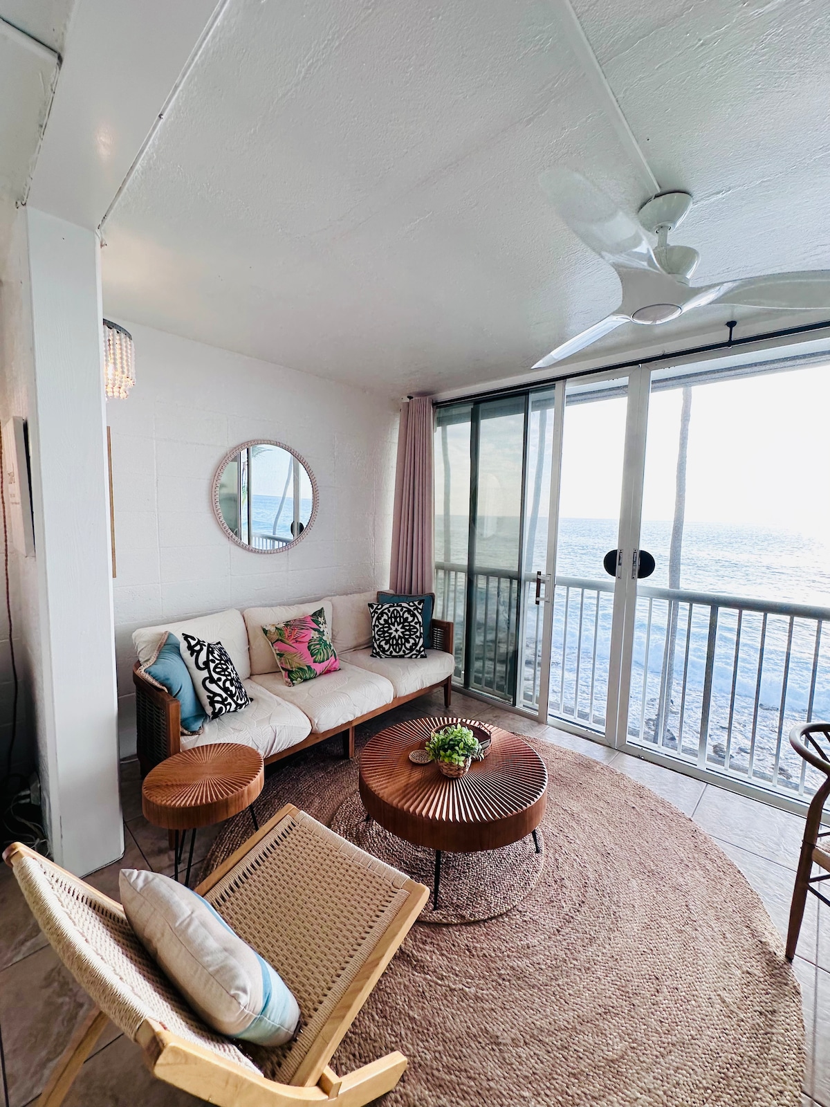 Direkt am Meer, neu renovierte, geräumige, gehobene Eigentumswohnung in einem geschlossenen Boutique-Komplex. Unglaubliche Aussicht von der Veranda, dem Wohnzimmer und dem Schlafzimmer. In der Nähe von allem! 1-2 Blocks vom Honl's Beach, Bauernmarkt, Restaurants, Bars und Geschäften im Dorf Kailua entfernt. Neues Kingsize-Bett und Queensize-Schlafsofa mit Memory-Schaumstoffmatratze für bis zu 4 Gäste. Beheizter Salzwasserpool am Meer mit Außendusche und Gemeinschaftsgrill. Ruhig; kein Lärm vom Ali'i Drive. Reservierter Parkplatz. Klimaanlage. Aufzug.