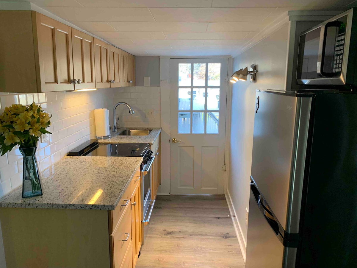 Die Lower Village Lofts *North* sind neu renovierte große Studio-Apartments im Herzen des Geschehens – nur wenige Schritte vom Dock Square (Innenstadt von Kennebunkport) und 1/2 Meile vom Strand entfernt! Diese Einheit verfügt über eine brandneue, voll ausgestattete Küche, komplett neue Designer- und hochwertige Möbel sowie eine maßgefertigte Raumteilerwand mit einem elektrischen Kamin, einem Kleiderschrank und einem 50-Zoll-Smart-TV. Der Schlafbereich verfügt über ein neues Kingsize-Bett mit luxuriöser Bettwäsche, Verdunkelungsrollos und einem zusätzlichen Smart-TV.