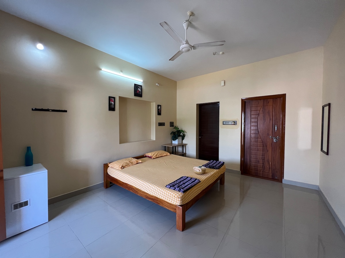 Welcome to Vasantha’s Home Stay -- a clean, peaceful and secure place for families and groups. Enjoy a spacious living room with Smart TV, large AC bedroom with 2 queen-size beds, dressing area and safe storage. Cook with ease in the fully equipped kitchen with a stove, fridge and utensils, while a washing machine is available for laundry. Includes an attached hot-water bathroom plus a common wash area. Secured with CCTV and a remote-operated gate, offering a safe home-away-from-home experience.