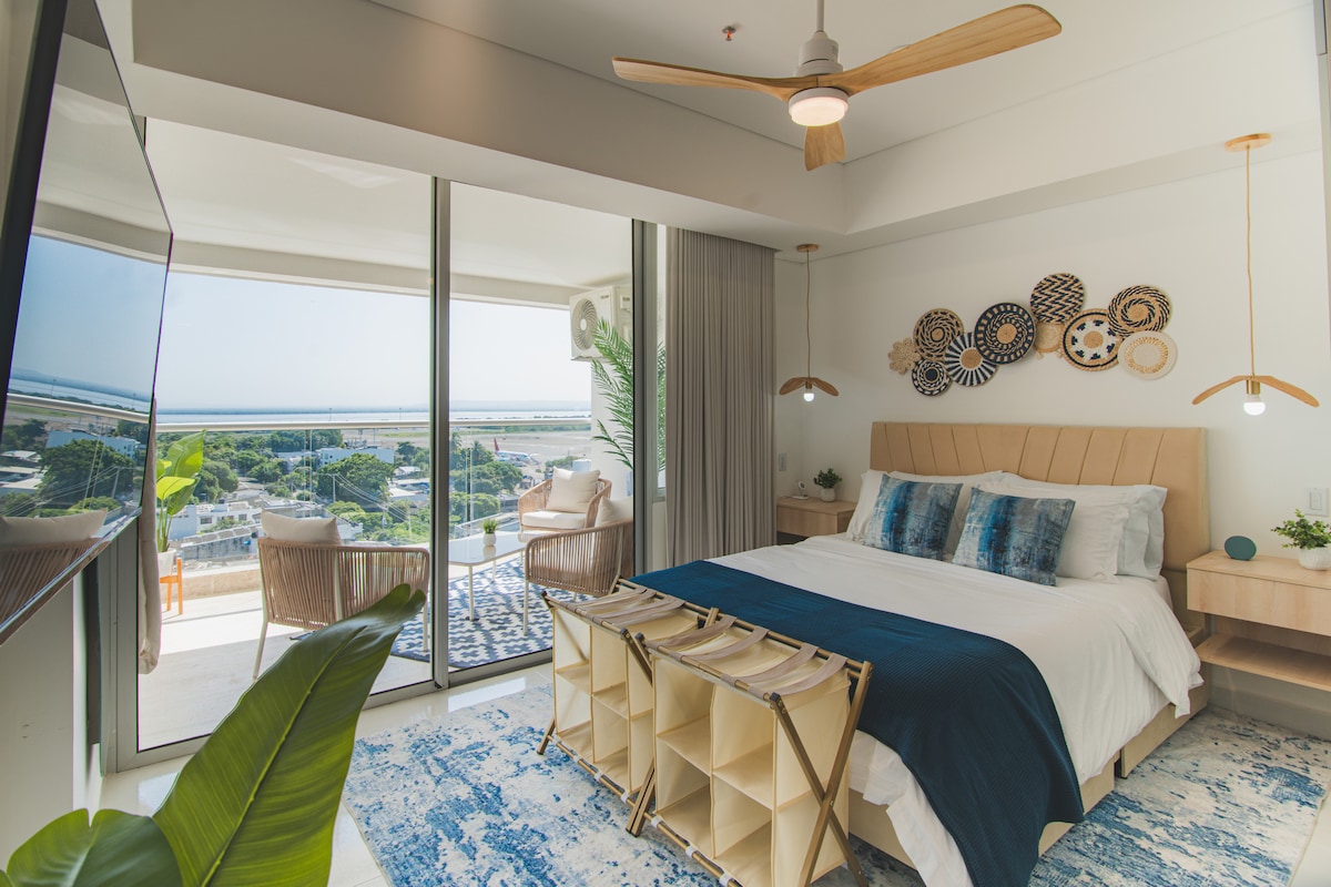 Modernes Apartment mit einem Schlafzimmer mit Kingsize-Bett, ideal gelegen: nur 3 Gehminuten vom Strand, 5 Minuten vom Flughafen Rafael Núñez und 10 Minuten von der Altstadt entfernt. Die Wohnung ist für maximalen Komfort voll ausgestattet, einschließlich schnellem WLAN, voll ausgestatteter Küche, Waschmaschine und heißem Wasser – eine seltene Annehmlichkeit in Cartagena. Das Gebäude bietet einen Fitnessraum, Sicherheit und eine geräumige Dachterrasse mit 2 Whirlpools mit Blick auf das Karibische Meer.