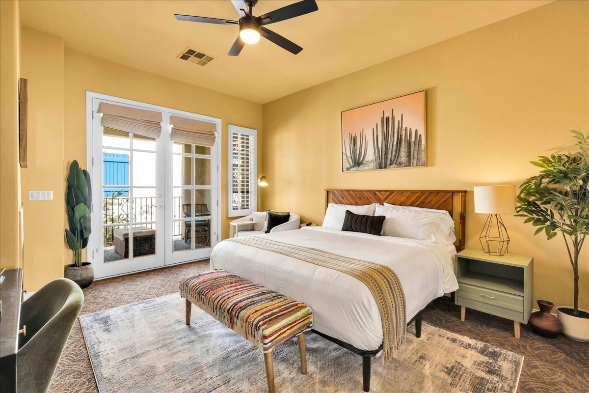 Das Legacy Palms ist eine neu renovierte, geräumige und helle 2-Zimmer-Wohnung mit 2 Badezimmern und einer modernen kalifornischen Wüstenatmosphäre. Fenstertüren öffnen sich zu einem großen privaten Balkon mit Ess- und Sitzbereich, mit Blick auf das üppige Villengelände und die Wasserbrunnen. Sie verfügt über eine voll ausgestattete Küche mit neuen Edelstahlgeräten, 3 Smart-TVs, einen Essbereich, 2 Kamine und eine ausziehbare Queensize-Schlafcouch im Wohnbereich. Das Gemeinschaftsgelände verfügt über 12 beheizte Pools und Spas, einen Fitnessraum, Hängematten, Grills und vieles mehr!