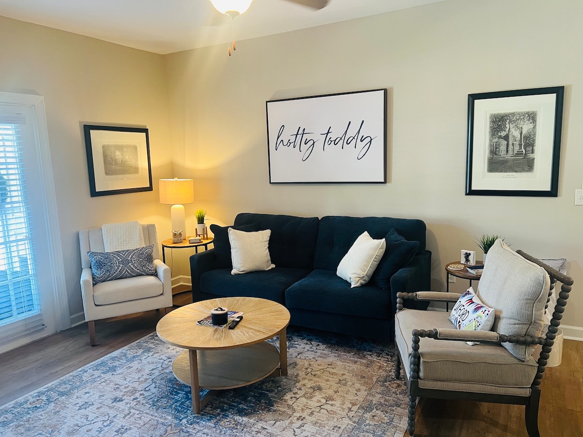 NEU RENOVIERTE Eigentumswohnung, die für alles geeignet ist, wenn du in diesem zentral gelegenen Stadthaus übernachtest! Eingebettet in eine geschlossene Wohnanlage, liegt dieses aktualisierte 2-Schlafzimmer/1,5-Badezimmer nur wenige Gehminuten vom Ole Miss Campus entfernt. Tolle Lage für alle deine Spieltag-Aktivitäten oder Wochenendausflüge. In der Nähe von Restaurants und nur 2 Meilen vom Oxford Square entfernt! Schlafplätze für 6 Personen mit einem Kingsize-Bett und zwei Queensize-Betten. Ausgestattete Küche, Waschmaschine/Trockner, Smart-TV, private Außenterrasse und Gemeinschaftspool.