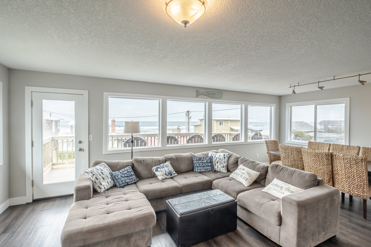 Osprey's Nest ist ein luftiger und lichtdurchfluteter Luxus-Rückzugsort am Meer mit atemberaubendem Panoramablick auf den Pazifik. Gewölbte Decken und Oberlichter sowie ein modernes, minimalistisches Design verleihen dem Haus eine saubere und übersichtliche Energie. In unserem Haus findest du einen gemütlichen Ort zum Lesen, um den Meerblick zu genießen oder ein kurzes Nickerchen zu machen. Tritt nach draußen, um dich auf der Terrasse zu entspannen und große Schlucke frische Meeresluft zu genießen, oder schlendere zum Strand, um Spaß in Rockaways sieben Meilen Sand und Wellen zu haben!