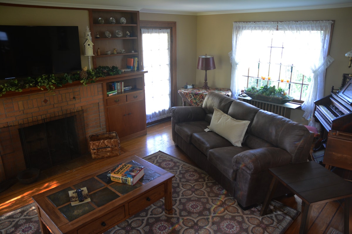 Dieses Fachwerkhaus, das in Buffalo Spree und Artvoice vorgestellt wurde, verfügt über ein atemberaubendes Interieur aus Hickory und schwarzer Walnuss, das durch zweistöckige Fenster, die der Morgensonne zugewandt sind, beleuchtet wird. Fußbodenheizung und Erdputz-Klimadesign. Wache in Queensize- und Kingsize-Betten auf, entspanne dich unter überdachten Veranden und kaufe direkt nebenan im Thorpe's Bio-Bauernladen ein. • 7 Minuten vom Dorf East Aurora • 24 Minuten vom Bills-Stadion entfernt • 1 Stunde von den Niagarafällen entfernt