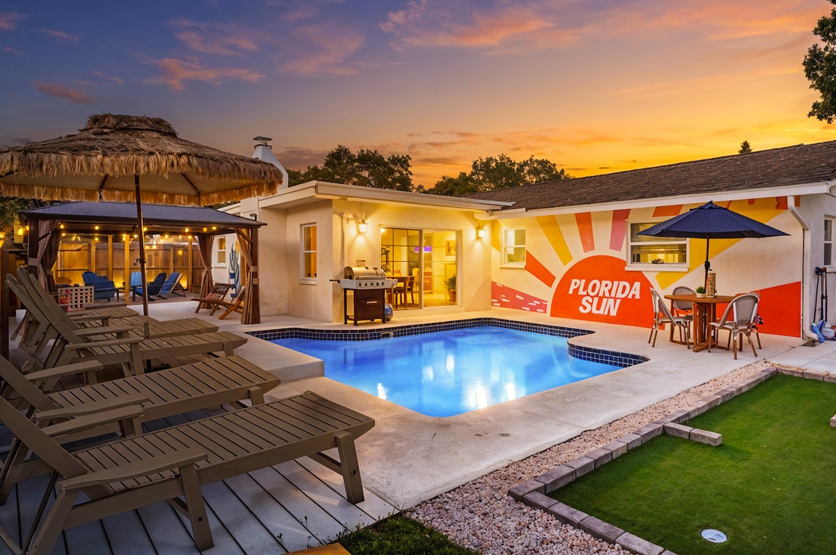 Einzigartige tropische Oase mit 2 Schlafzimmern mit direktem Zugang zum Pool, Tiki-Hütte und Tiki-Bar! LGBTQIA + willkommen! Hablo Español. Haustierparadies. Tropischer Airbnb-Rückzugsort! Unser einzigartiger beheizter PRIVATER Pool im Resort-Stil mit Wasserfällen und zwei Sonnenliegen, / in Poolliegen, umgeben von üppiger Landschaftsgestaltung, ist eine private Oase. 3 Schlafzimmer mit großem 3. Schlafzimmer mit 2 Queensize-Betten Nachts erwacht der Außenbereich mit Pool- und Landschaftsbeleuchtung zum Leben! Sie werden das Haus nicht verlassen wollen!