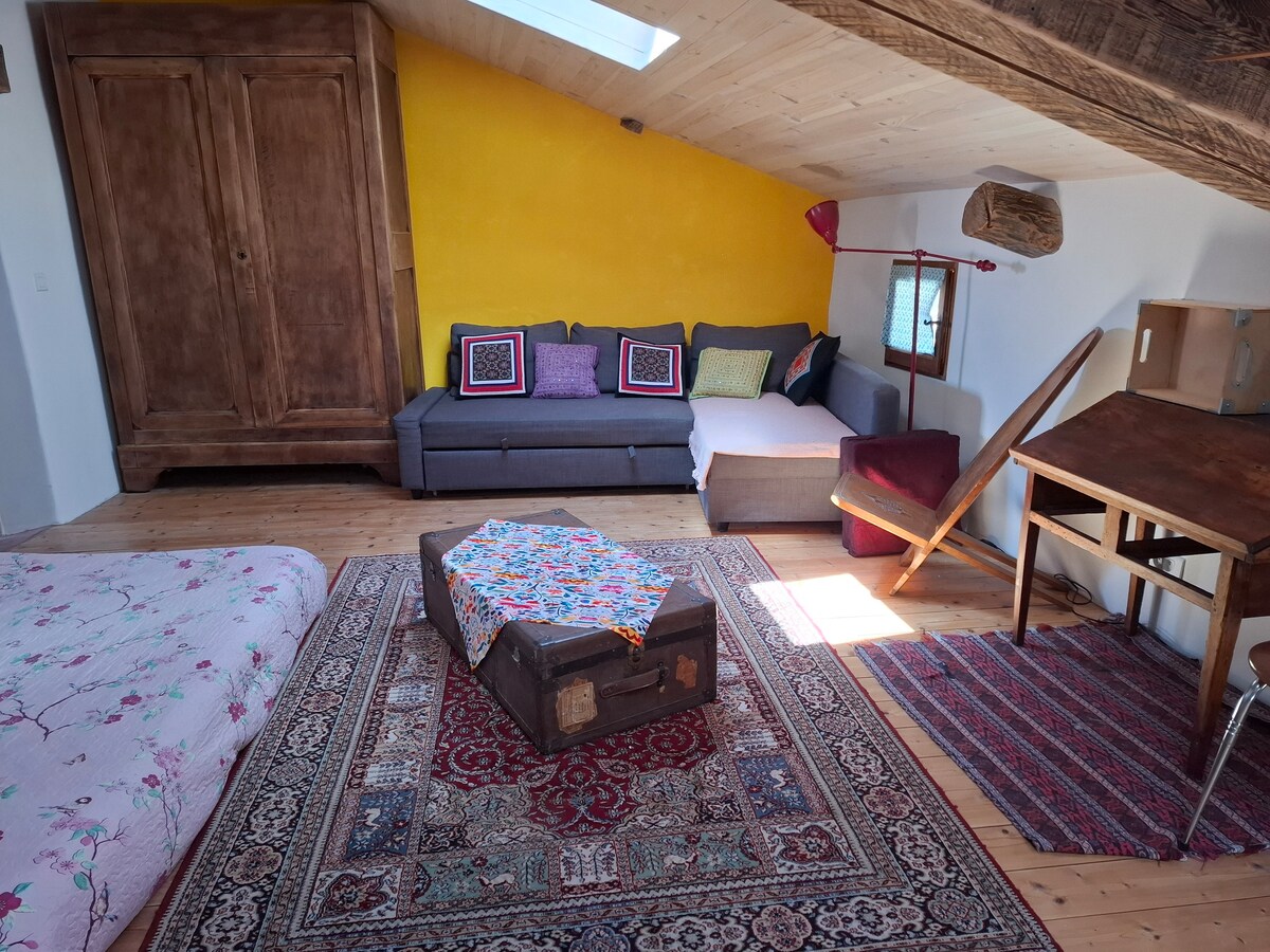 Charmant gîte d’env. 50 m2 sous combles, 1er étage d'une dépendance (à droite sur photo d’ensemble), terrain de 1 700 m2 où vivent les propriétaires très discrets. Seul gîte sur place. Piscine (7x4m), spa (2/4 p. à bulles), cuisine d'été (plancha), coin repas/salon, table ping-pong, trampoline, espace enfants (cabane, ...) et boulodrome à disposition (libre service). Parking : réservé et sécurisé Piscine : mai à oct (sécurisée) Spa : toute l’année (de nov à mars demander 24h avant arrivée)