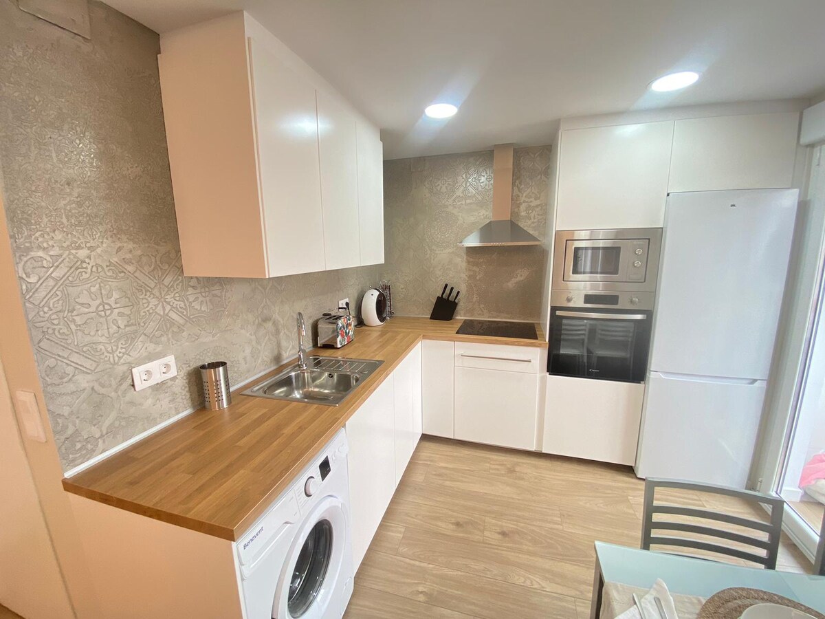 Elegante Wohnung 50 m. Schlafzimmer mit einem 1,50 Doppelbett und großen Schränken. Ein Schlafsofa von 1,40 im Wohnzimmer und ein eigenes Bad. Kostenloses WLAN sowohl in der Wohnung als auch in den restlichen Gemeinschaftsbereichen. Es gibt in allen Zimmern Klimaanlage. Voll ausgestattete Küche, sogar kleine Geräte wie Toaster, Saftpresse…. Die Wohnung hat eine eingebaute Waschmaschine im Küchenbereich. Wir haben eine Kaffeemaschine sowie Smart-TV