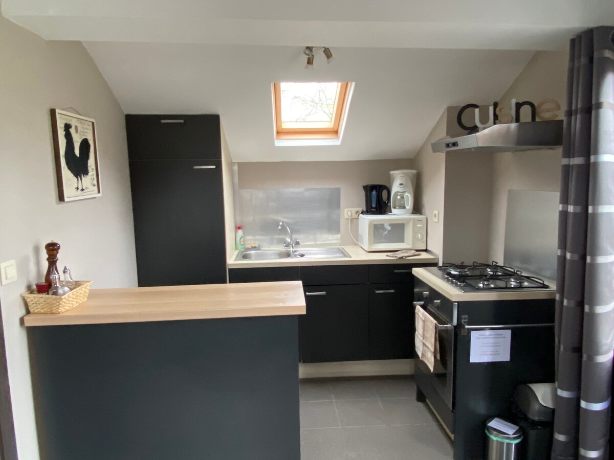 Wunderschönes modernes Studio, hell und gemütlich im 1. Stock einer komplett renovierten Scheune. Ruhig, im Herzen des Centre Ardenne, 100 m von Lebensmittelgeschäften, 200 m von einem Einkaufszentrum entfernt. Ideal für Paare. Ausgestattete Küche, separates Bad mit italienischer Dusche und WC. Große Terrasse von 25 m2 mit Tisch für 2 Pers. und Gartenmöbeln (Sommer). Waschmaschine gemeinsam mit den anderen Studios. Ein 160 cm Doppelbett + ein Schlafsofa (1 Erwachsener oder 2 Kinder) im selben Raum.