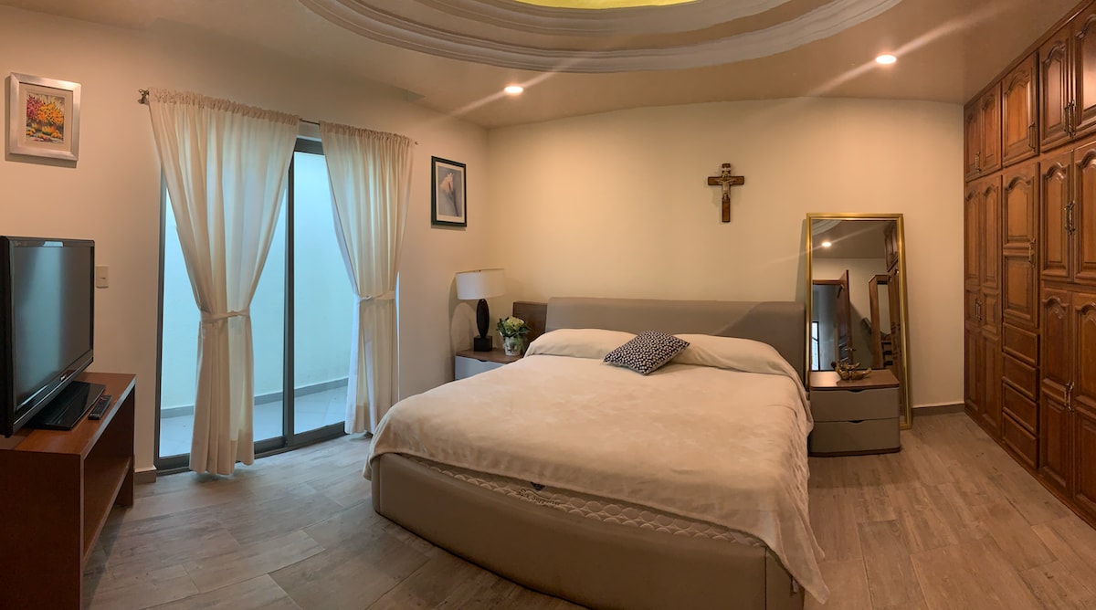 Bellísimo departamento, ubicado en el 2do.Piso, cuenta con 2 pisos en el 1er. la habitación de gran tamaño con vestidor y baño completo y jacuzzi, subiendo al Sig. Piso se encuentra la cocina, 1/2 baño, 1 cantina con sala, comedor, sala con sofá cama, con TV y 1 terraza con asador, calle privada, Lejos del ruido. Vista espectacular, vías de acceso rápidas, te va a encantar. Las TV cuentan con todas las plataformas y canales PPE. Ubicado en una de las mejores zonas residenciales. Reserva ya ✨