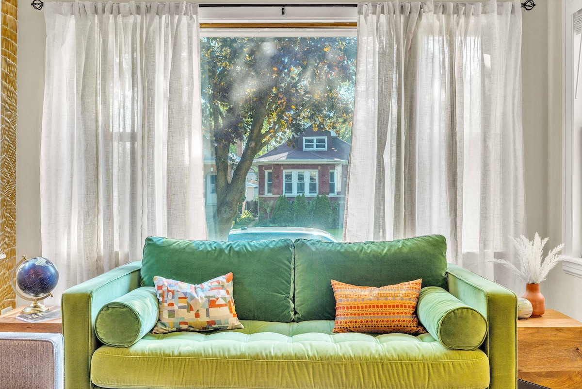 Experience the city in style at Retro Modern Bungalow, the perfect pad for up to 4 friends. Featuring two spacious bedrooms—each with a king bed and luxury linens—a propane fire pit and a fully fenced, pup-friendly backyard. Enjoy central HVAC, speedy WiFi, and a dedicated workspace. A pack-n-play crib is available at no cost. Central location just south of Oak Park, 15 mins from Midway airport, and 20 mins from downtown. Park for free in our garage or catch the train a few blocks away.