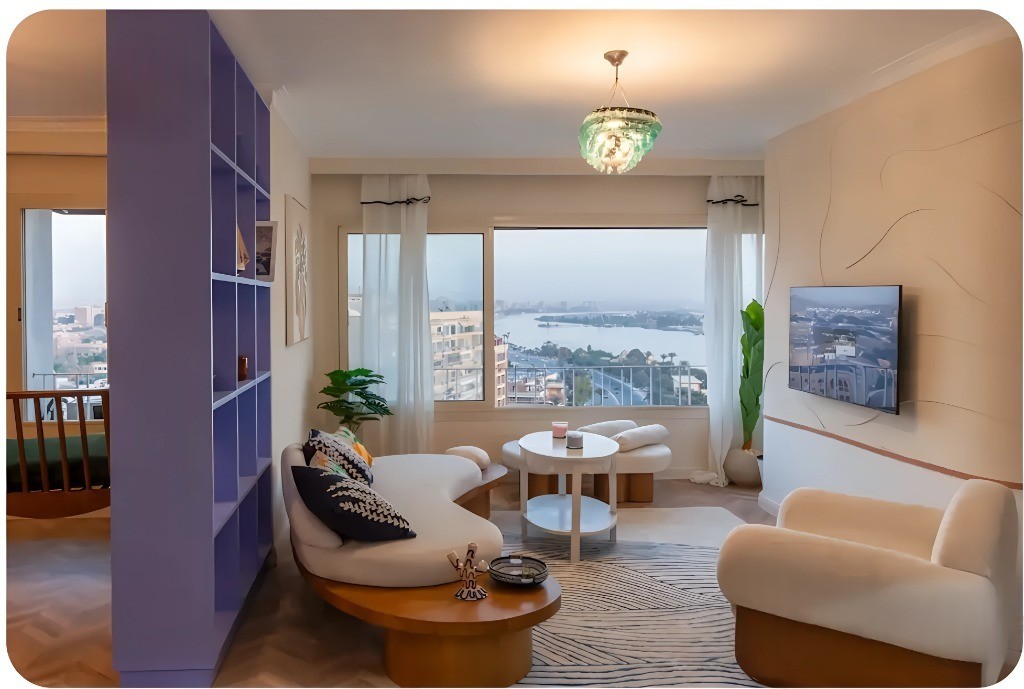 Luxurious Apartment with a stunning panoramic view of the Nile and the Pyramids of Giza ad Sakarra. Located in a prime area, just few minutes away from Cairo's top attractions, making it the perfect base for your visit. The modern, spacious apartment provides comfort and style, ideal for up to 6 guests. Whether you're relaxing by the Nile or exploring the city, you'll find everything you need for an unforgettable stay. For any additional requests, feel free to contact us anytime :)