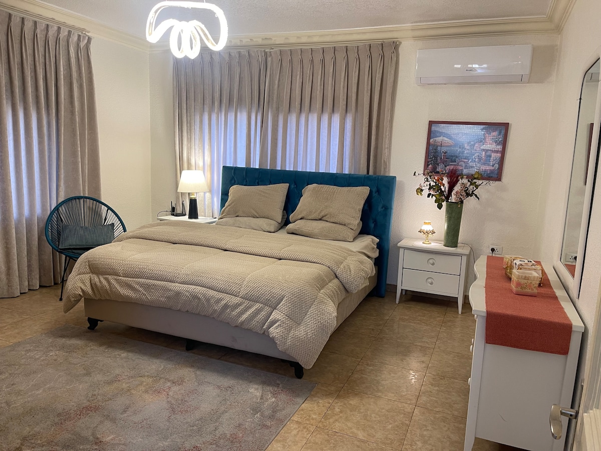 Diese Wohnung bietet alles für einen erholsamen Aufenthalt, einschließlich eines privaten Eingangs für zusätzliche Privatsphäre und einer schönen Terrasse, auf der du deinen morgendlichen Kaffee oder Sonnenuntergang genießen kannst. Die Wohnung ist gut eingerichtet, mit zwei gemütlichen Schlafzimmern, einem hellen Wohnbereich, einer voll ausgestatteten Küche und modernen Annehmlichkeiten, um deinen Aufenthalt angenehm zu machen. Unsere Unterkunft liegt nur wenige Minuten von lokalen Cafés, Restaurants und der einfachen Anbindung an die wichtigsten Sehenswürdigkeiten in Amman entfernt und bietet die perfekte Mischung aus Komfort und Bequemlichkeit.