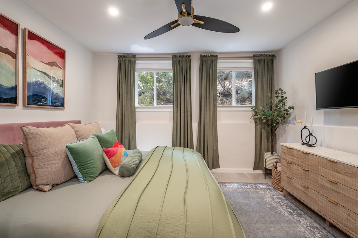 Reise in die Vergangenheit in dieser zweistöckigen Unterkunft im Stil der 70er-Jahre, die entworfen wurde, um das Beste aus der Aussicht zu machen. Sorgfältig gesammelte Vintage-Stücke vermischen sich mit zahlreichen Pflanzen, reichlich Büchern und einem Plattenspieler. Beobachte die reiche Tierwelt durch die Fenster. HINWEIS: Wir leben in einer Gegend, die von Wildtieren, Pferden, Hunden und einer Vielzahl von Pflanzen umgeben ist (unser Viertel heißt Fernwood, weil es das grünste und üppigste Viertel der Meeresschicht des Ozeans ist). Wenn du also Allergien oder Asthma hast, ist diese Unterkunft vielleicht nicht die beste für dich. Gelegentlich erlauben wir auch Hunde, nur wenn dies im Voraus genehmigt wurde. Der Raum im Obergeschoss ist hell und luftig und dreht sich alles um die Aussicht! Die Küche ist mit einer Mischung aus gebrauchten und neuen Küchenutensilien gefüllt. Ich liebe es, schöne Holzschalen und Keramik zu sammeln, perfekt, um deine hausgemachten Gerichte zu präsentieren. Wir versuchen, die Küche mit einigen grundlegenden Dingen wie Olivenöl, Balsamico-Essig, Meersalz, Knoblauch, Senf, Ketchup, Sojasauce und mehr auszustatten – auf diese Weise musst du dir keine Gedanken machen, so viele Artikel im Laden abzuholen. Das Badezimmer ist klein und minimalistisch, bietet aber alles, was du benötigst. Ich habe auch einen Korb mit Strandtüchern bereitgestellt. Gehe die Treppe hinunter zu einem offenen Schlafzimmer mit Holzdecken und einem großen Kleiderschrank. Das Bett ist ein brandneues Tuft & Needle King. Es gibt einen Schreibtisch, wenn du arbeiten musst. Das Zimmer öffnet sich zu einem geschlossenen, halbprivaten Außenbereich. Wir wohnen auf der anderen Straßenseite im Haupthaus, sodass du vielleicht Einblicke in uns durch die Privatsphäre-Partition siehst. Ich teile immer gerne Kräuter oder Gemüse aus dem Garten. Es gibt Betonböden und viele natürliche Holzelemente im gesamten Raum. Es gibt eine Wandheizung in jedem Zimmer, um es gemütlich zu halten. Unser Haus wurde in den 60er Jahren gebaut und dann in den 70er/80er Jahren viel renoviert, als eine Hippie-Kommune namens „Peace Farm“ hier lebte. Es hat viele Eigenheiten, aber deshalb lieben wir Topanga :) Auf der anderen Seite deiner Terrasse befindet sich unser Innenhof mit zwei Gartenbeeten. Sieh sie dir gerne an und pflücke ein paar Kräuter. Wir sehen oft Waschbären, Rotluchse, Eichhörnchen und sogar gelegentlich eine Schlange in unserem Hof, also achte immer darauf, wo du läufst. Dein privater Eingang befindet sich direkt neben deinem Parkplatz in der Einfahrt, sodass die Möglichkeit besteht, dass du uns überhaupt nicht begegnest. Wir arbeiten viel und sind immer unterwegs, aber wir lieben es, Gäste zu treffen, damit wir verfügbar sein können, wenn du uns treffen und einige lokale Tipps erhalten möchtest. Oder wenn du es vorziehst, können wir total Abstand halten ;) Spaziere auf dem geheimen Weg, der nur wenige Augenblicke entfernt liegt, um einige freundliche Nachbarn und Hunde zu treffen. Die sanfte Meeresbrise bedeutet, dass die Einheimischen diese Gegend „klimaperfektes Fernwood“ nennen. Von hier auf der Westseite von Topanga sind es weniger als 15 Minuten zum Strand. Wir befinden uns im hügeligen Teil des Canyons, was die beste Aussicht, aber auch enge steile Straßen bedeutet. Lass es langsam angehen und genieße die Klänge der Natur! Dieses Viertel ist aufgrund seiner üppigen Landschaft als Fernwood bekannt, die für Allergiker möglicherweise nicht ideal ist. Es ist am besten, ein Auto in LA zu haben, weil es so weitläufig ist. Du kannst von unserem Haus aus zu Fuß in unsere kleine Stadt Topanga gehen, aber es sind etwa 2 Meilen bergab und dann musst du wieder bergauf gehen!! Wir haben es geschafft und es ist nicht schlecht. Es gibt auch einige tolle Wanderwege, die nur wenige Schritte von uns entfernt sind. In unserer Stadt findest du einen tollen Fahrradladen, in dem du ein Mountainbike mieten kannst, und sie geben dir jede Menge Informationen darüber, wo du fahren kannst. Uber & Lyft kommen auf Anfrage hierher, aber es braucht manchmal etwas Geduld. Wir sind etwa 10–15 Autominuten von unserem örtlichen Strand mit vielen kostenlosen Parkplätzen auf der Straße am Topanga Blvd entfernt (sieh dir die Schilder an, um sicherzustellen, dass du dich in einer kostenlosen Parkzone befindest). Wenn du das erste Mal zu unserem Haus fährst, wirst du vielleicht ein wenig von den kurvenreichen Straßen abgeschreckt sein! Es mag sich wie eine Ewigkeit anfühlen, aber es ist eigentlich nur 1 Meile vom Hauptboulevard zu unserem Haus. Fahre langsam und genieße die Sehenswürdigkeiten ... schöne Felsformationen, die Frösche, die am Bach singen, und die skurrilen Häuser! Wir haben zwei kleine Rettungshunde, die sehr aufgeregt werden, wenn neue Leute zu Besuch kommen. Wenn du also keine Hunde magst, ist dies möglicherweise nicht die beste Option ;) Wir nehmen sie überall mit hin, damit keine lästigen Hunde deinen friedlichen Rückzugsort ruinieren. Außerdem wohnen wir neben Pferden, sodass es tagsüber und nachts zu interessanten Geräuschen kommen kann. Das Parken ist in unserer kleinen Sackgasse sehr begrenzt, also stelle bitte sicher, dass du an der dafür vorgesehenen Stelle in unserer Einfahrt parkst. Ich sende dir vor deiner Ankunft Anweisungen. Wenn du rauchst, verwende bitte den dafür vorgesehenen Aschenbecher auf der Terrasse. Wir befinden uns in einer Feuerzone, also rauche nicht in der Nähe von Gestrüpp. Wenn du drinnen rauchst, muss ich eine Gebühr von 200 US-Dollar von deiner Kaution abziehen. Rauchen im Canyon ist ziemlich verpönt, da sich alle Sorgen um Brände machen, daher empfehle ich, einen Vape Pen mitzubringen, damit du Blicke vermeiden kannst ;) Der Handyempfang ist im Canyon nicht großartig, also sei bitte darauf vorbereitet, keinen Empfang zu haben, bis du dich mit unserem WLAN verbunden hast. Sei auf Strom- und Internetausfälle, 
